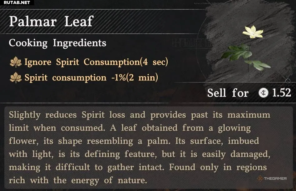 Я нашёл этот Пальмровый лист в регионе Деменисс, у Полумесячного озера. Не каждое собранное растение даёт лист, но они очень ценны и являются отличным алхимическим материалом для восстановления духа. Также несколько листьев можно найти возле могилы Цзяня в Пайлуне.