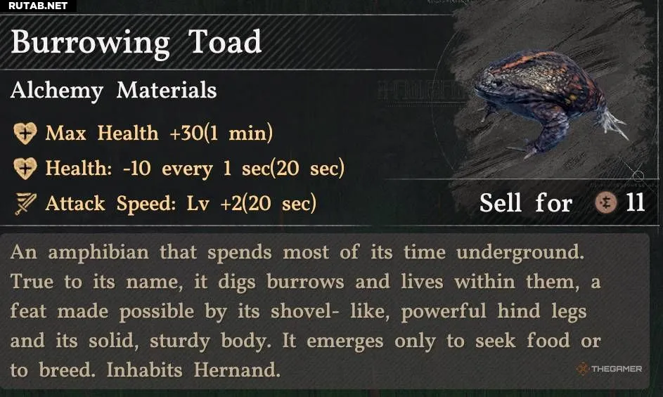 Я нашёл эту норную жабу возле небольшого пруда, в камышах и грязи, к югу от города Хернанд. Это было маленькое озеро рядом с Гильдейским домом Голдлиф, и там было много жаб.