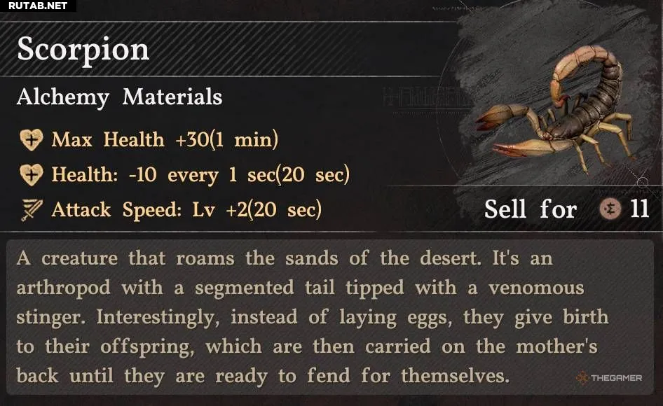 Этот скорпион был найден на самом юге Crimson Desert, в ущелье Крукрок.