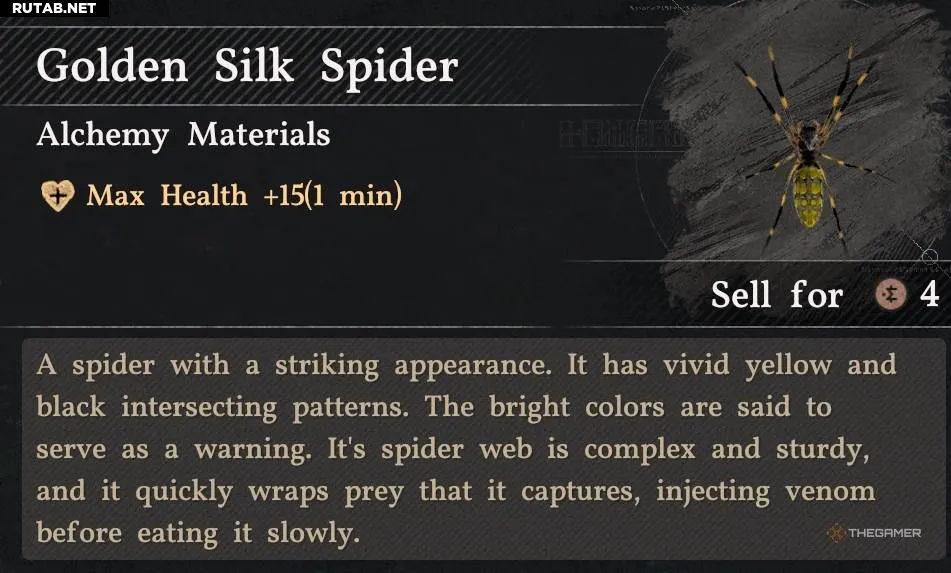Этот золотой шёлковый паук был найден недалеко от Воющего холма, у лагеря Седогривых. Я нашёл его ночью.