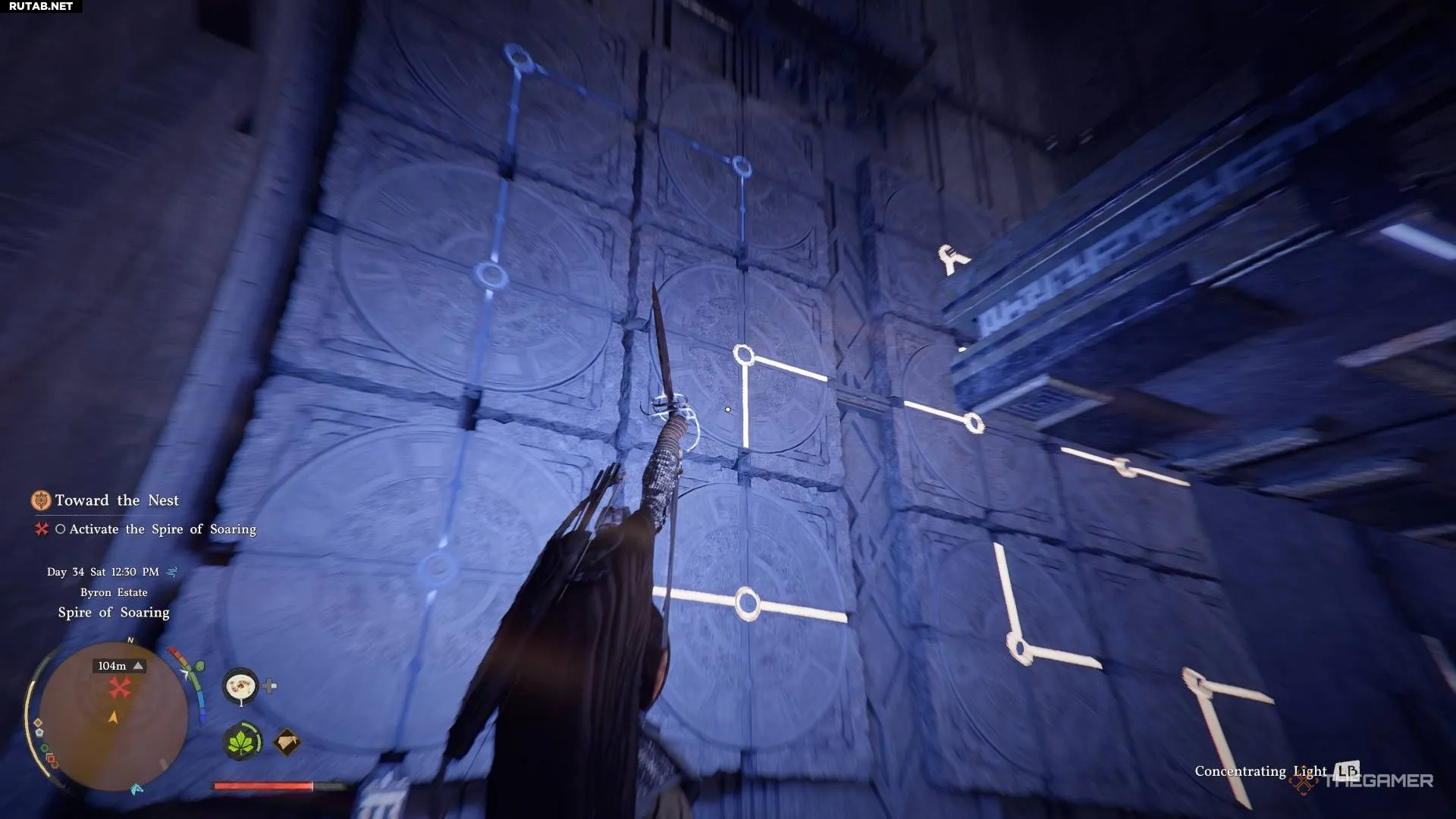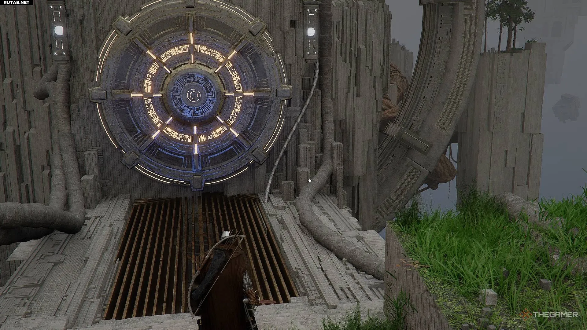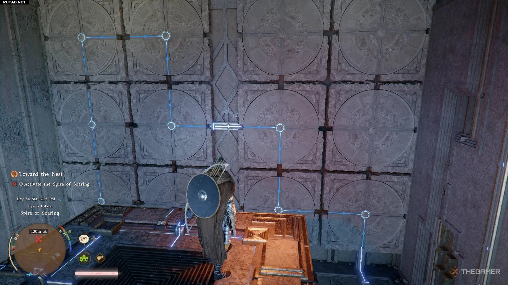 На стене расположены несколько элементов, которые можно вращать с помощью Силы Аксиомы. Нужно выровнять их так, чтобы энергия текла слева направо. Используйте меч, чтобы подсветить энергетические потоки на плитках, а затем поверните их в соответствии с паттерном на изображении выше.