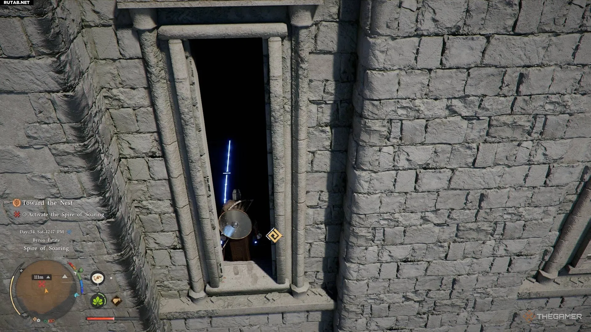 Однако дверь сломана, и войти нельзя. Единственный способ — забраться. Спереди от башни (со стороны двери) есть разбитое окно, а также окна по бокам, в которые можно влезть. Существует и подземный вход у скал внизу, но проще забраться через окно, так как это сразу приведет к головоломке.