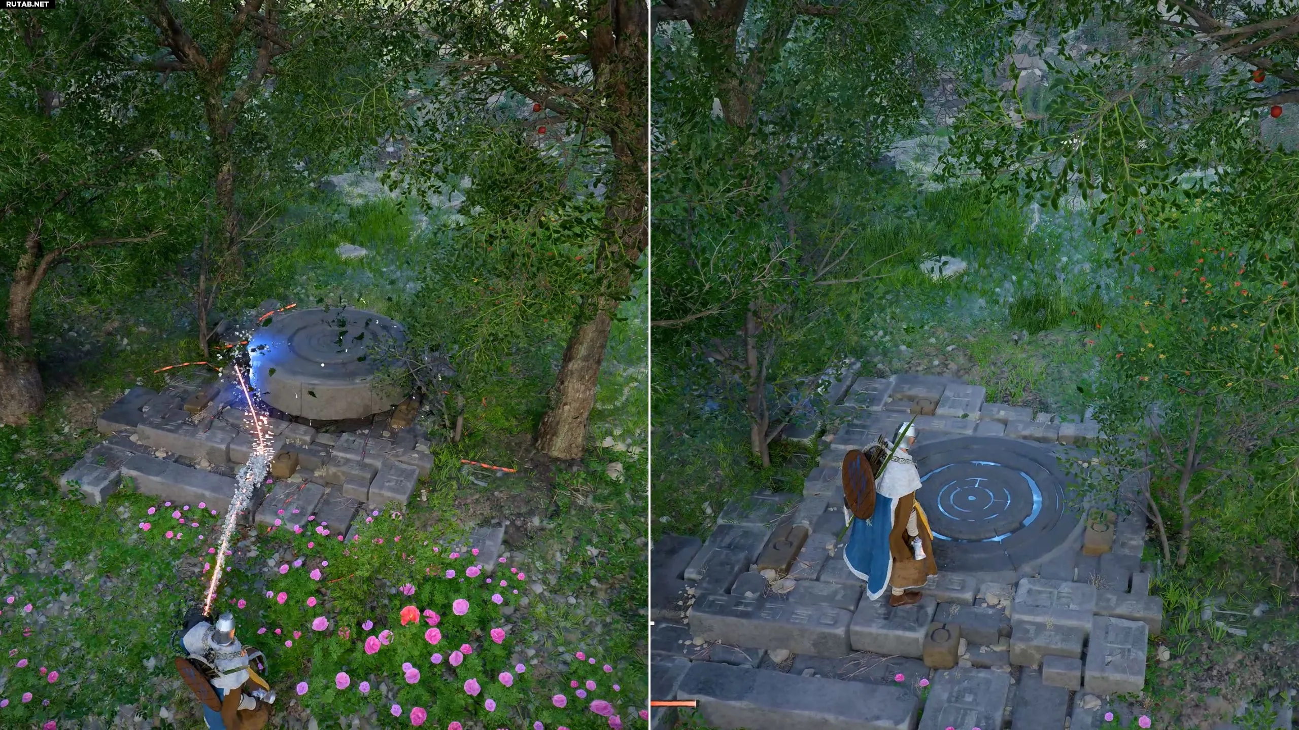 Это место с двумя деревьями и каменным сооружением, скрытым виноградными лозами. Используйте способность ослепляющей вспышки (LB/L1 + RB/R1 для активации навыка, затем LB/L1, удерживая RB/R1, чтобы сфокусировать свет), чтобы разжечь огонь и сжечь лозы.
