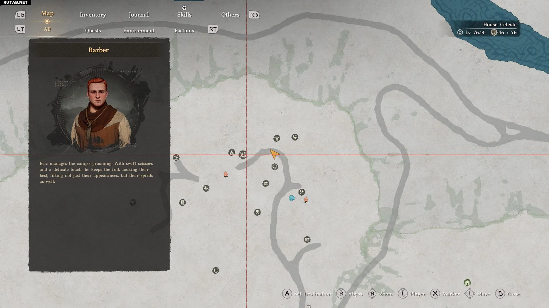 На карте парикмахерская Эрика обозначена логотипом с ножницами и расческой. Она расположена в палатке к востоку от ранчо и фермы в лагере.