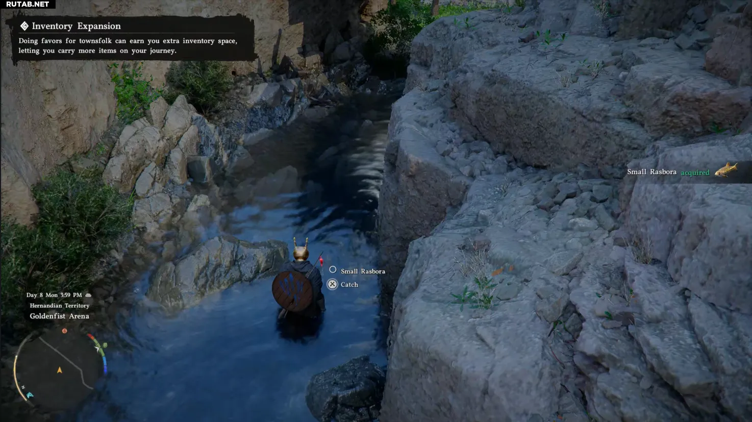 Этот способ проще, но требует, чтобы вы физически увидели рыбу в воде. Просто зайдите в водоём, найдите рыбу и подплывите к ней. Появится подсказка нажать кнопку взаимодействия (E на клавиатуре, X на Xbox, Square на PS5). Нажмите её — и рыба окажется в инвентаре.