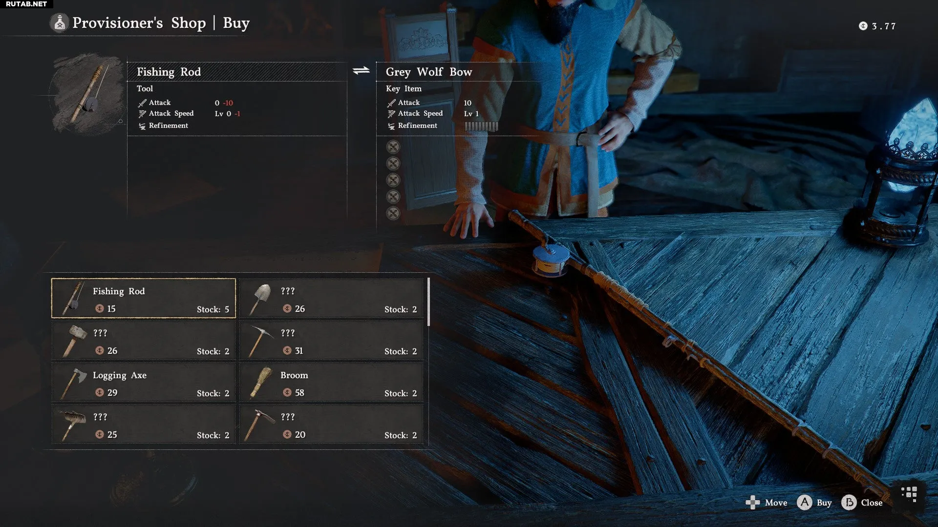 Добравшись до первого города Хернанда, зайдите в лавку поставщика и купите удочку всего за 15 медных монет. Если вы пропустили первый урок, просто наведите курсор на удочку в магазине, и полоса изучения появится снова. После покупки можно идти к любому водоёму.