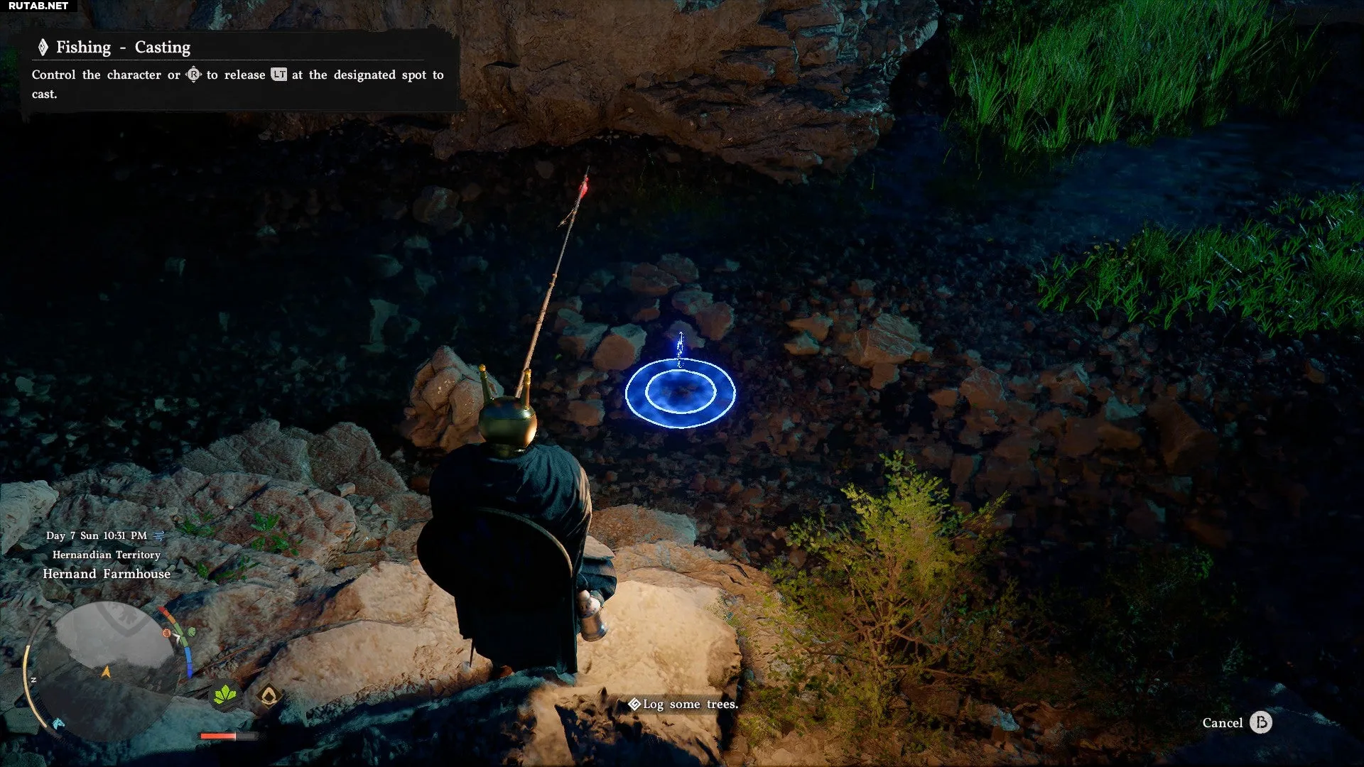 Сначала убедитесь, что удочка экипирована. Откройте колесо инструментов/оружия и выберите её. Подойдите к воде и наведите удочку (левая кнопка-триггер на геймпаде) так, чтобы появился синий круг, а не красный крестик. Прицел с крестиком заставит Клиффа автоматически сматывать леску.