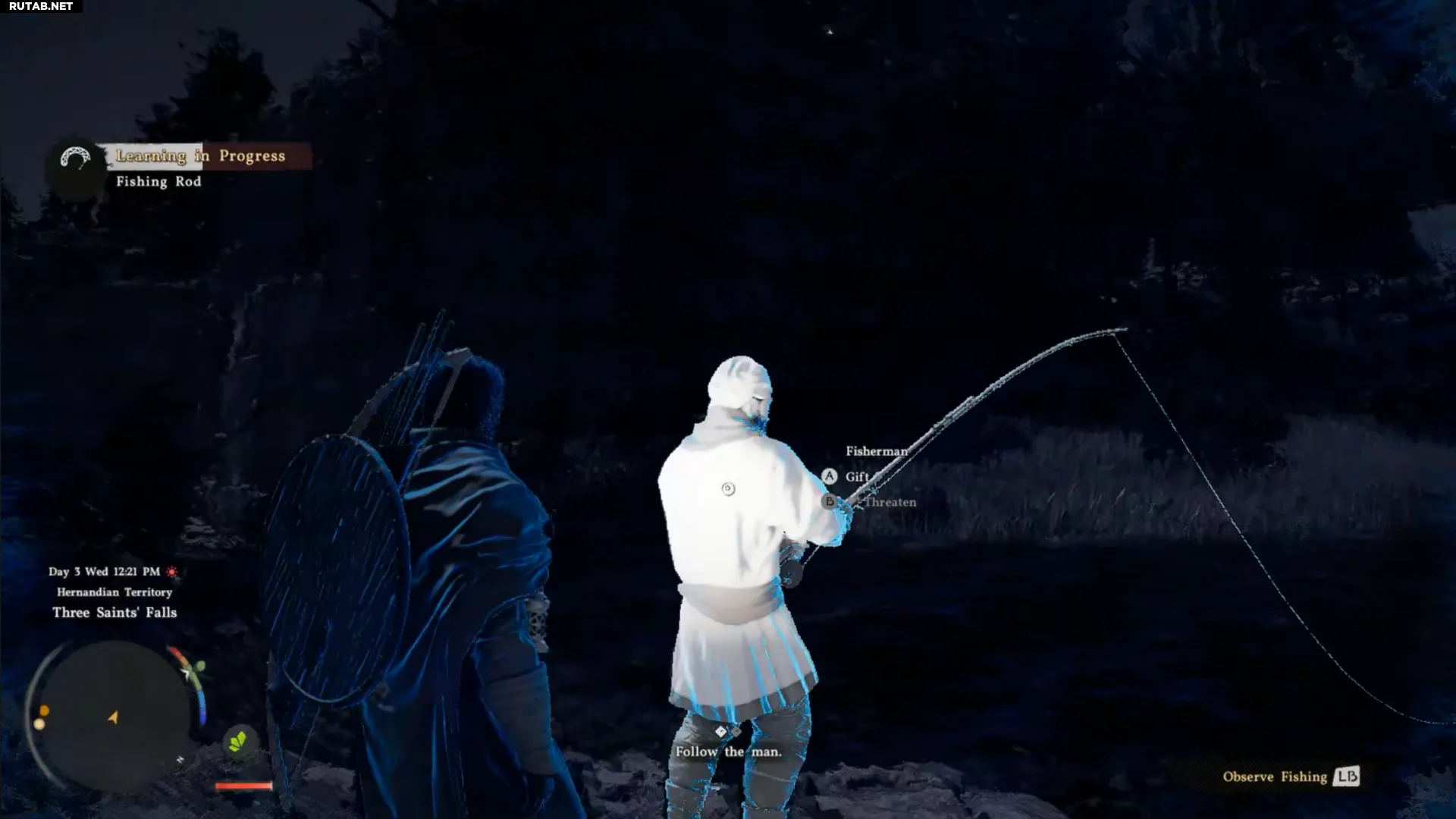 Первый шанс узнать о рыбалке появляется в самом начале игры. После выхода из Бездны, в кат-сцене, Себастьян просит Клиффа следовать за ним. Поднявшись с бревна, посмотрите направо — там будут рыбаки. Подойдите и осмотрите их. Экран станет синим, а в левом верхнем углу появится полоса «Идёт изучение… — Удочка». Когда она заполнится, откроется обучающее окно с основами рыбалки. Но сама ловля станет доступна позже.