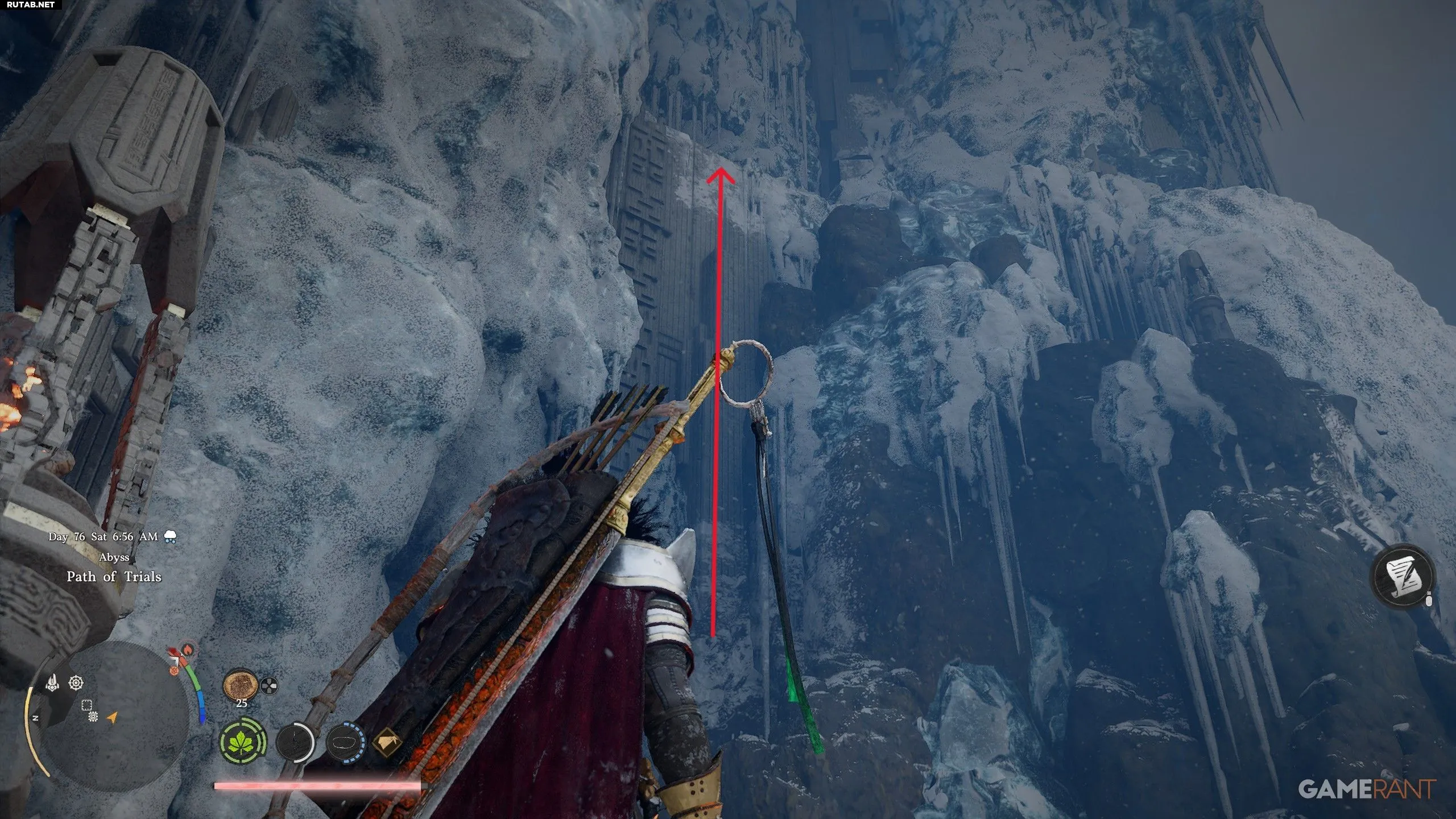 - Встав лицом на север, посмотрите вверх и направо. Используйте прыжок и тройное «Силовое Ладонь» (R3), чтобы взобраться на каменную стену.