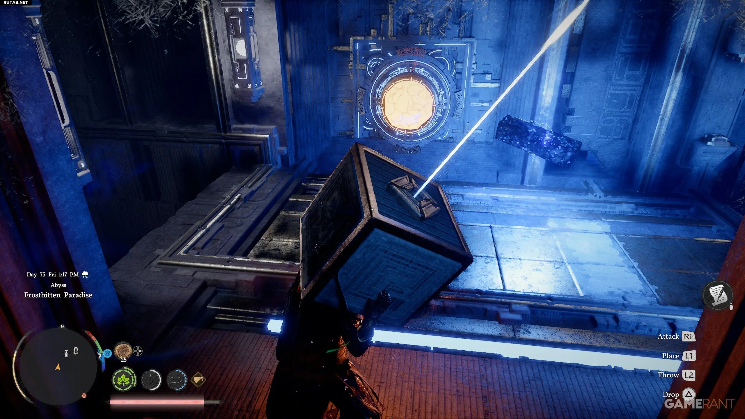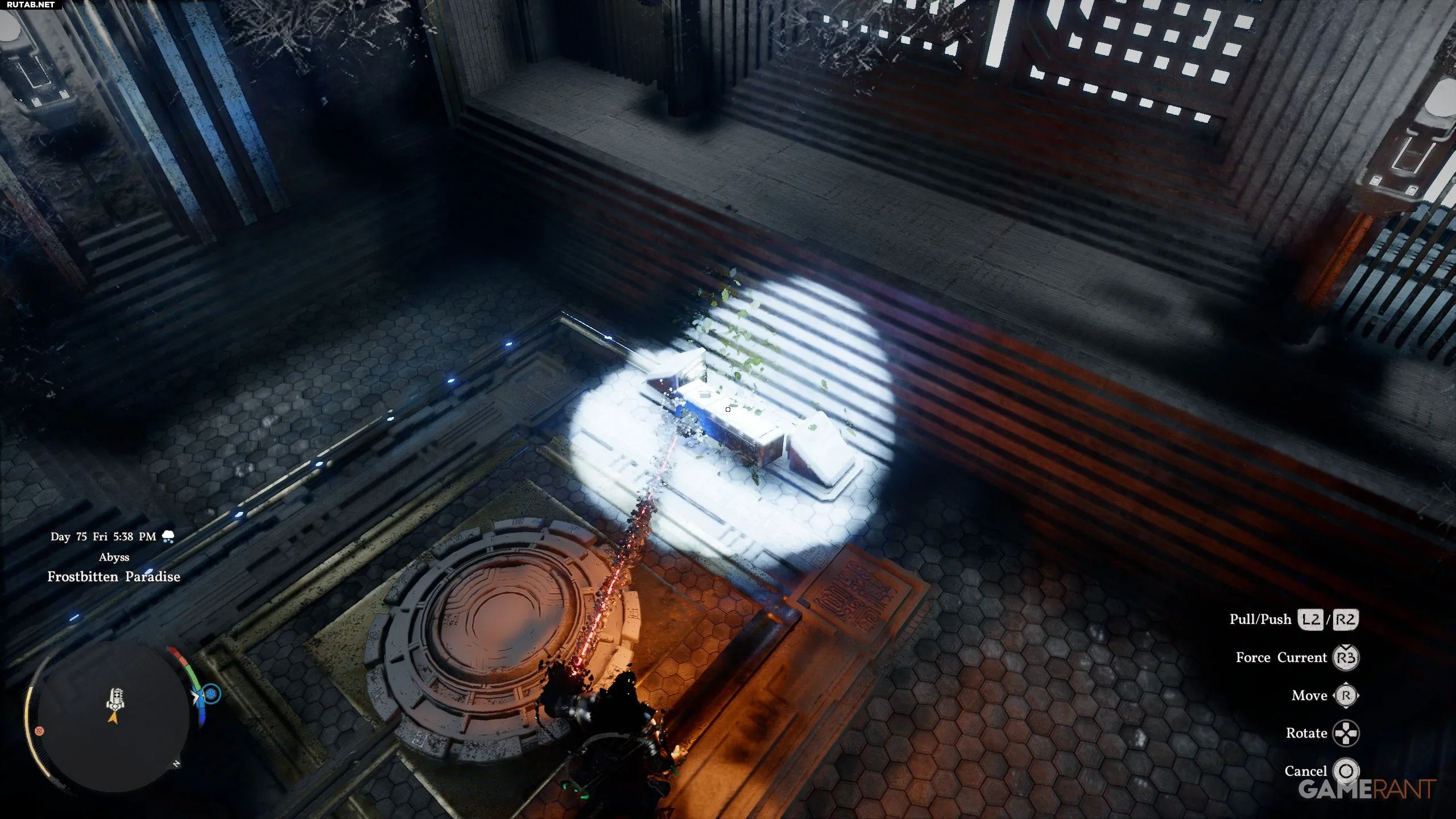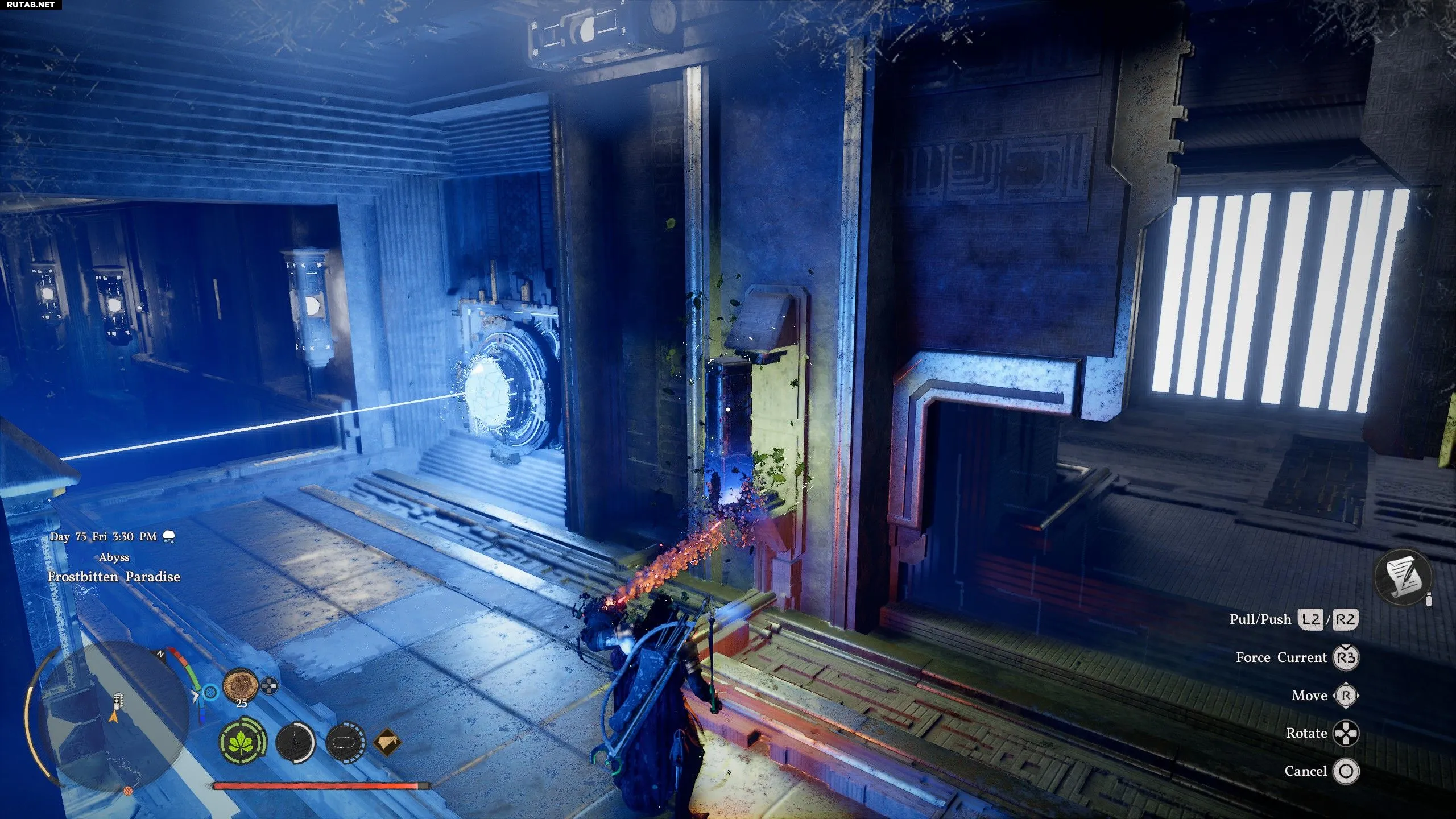 Притяните батарею к закрытой двери с помощью Силы Аксиомы. Используйте «Ослепляющую вспышку» (L1+R1+L1) на жёлтом кристалле, чтобы открыть дверь, и быстро протащите через неё батарею и себя, пока проход снова не закрылся. Протолкните батарею в отверстие в полу и проползите за ней. Поместите батарею в пустой слот на полу в западной части комнаты и ударьте по ней «Ударом ладони», чтобы активировать телепорт.
