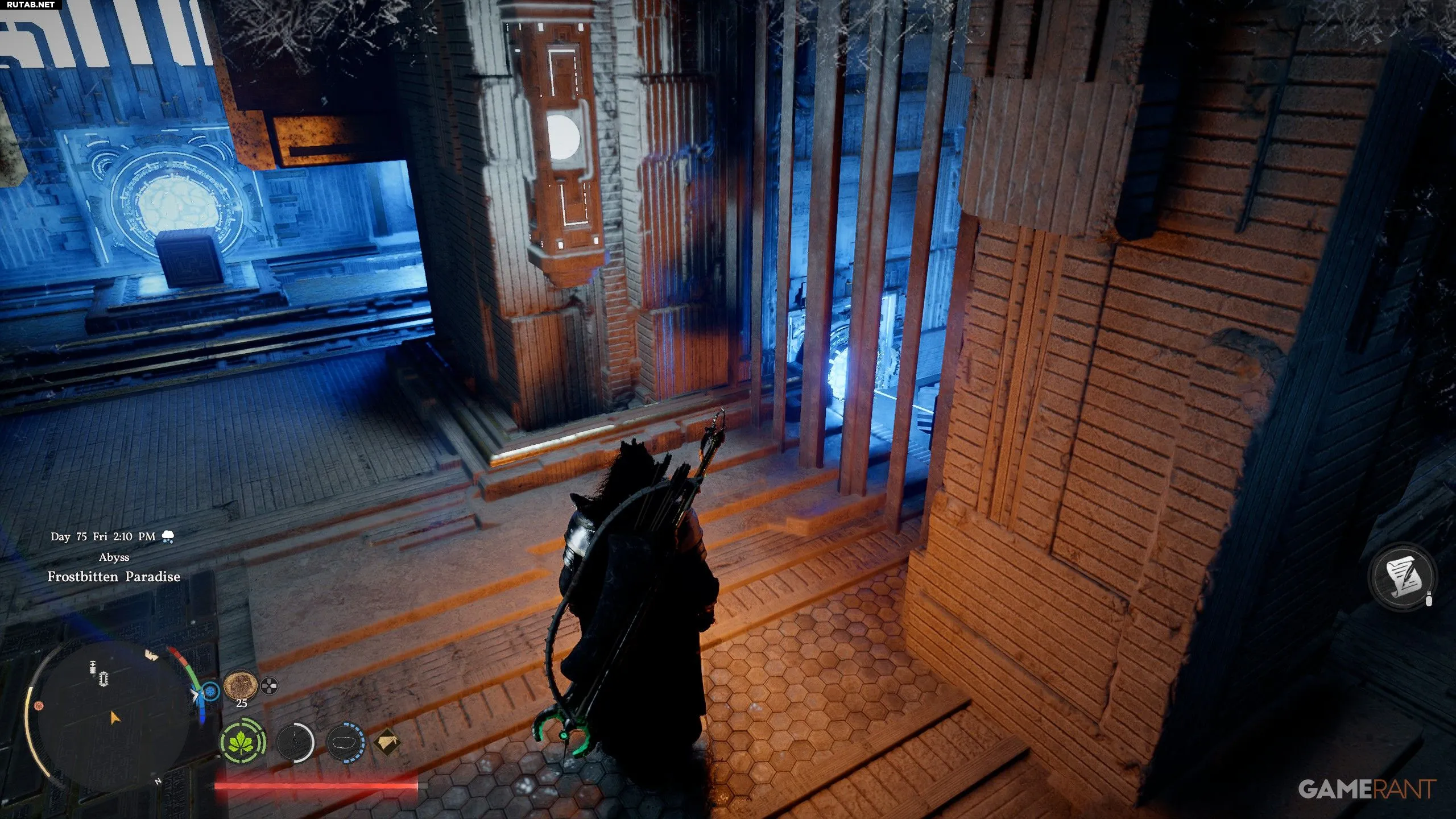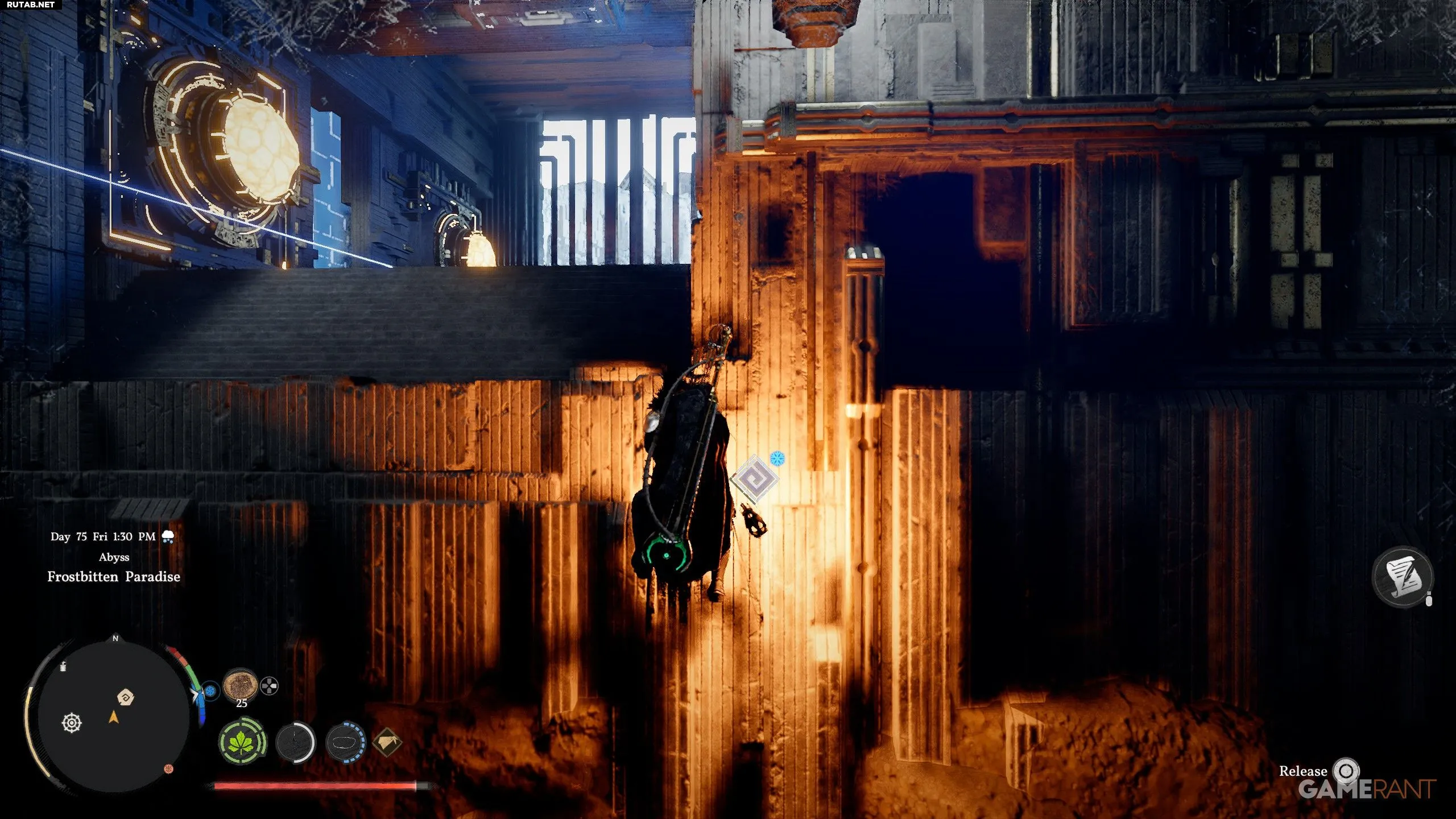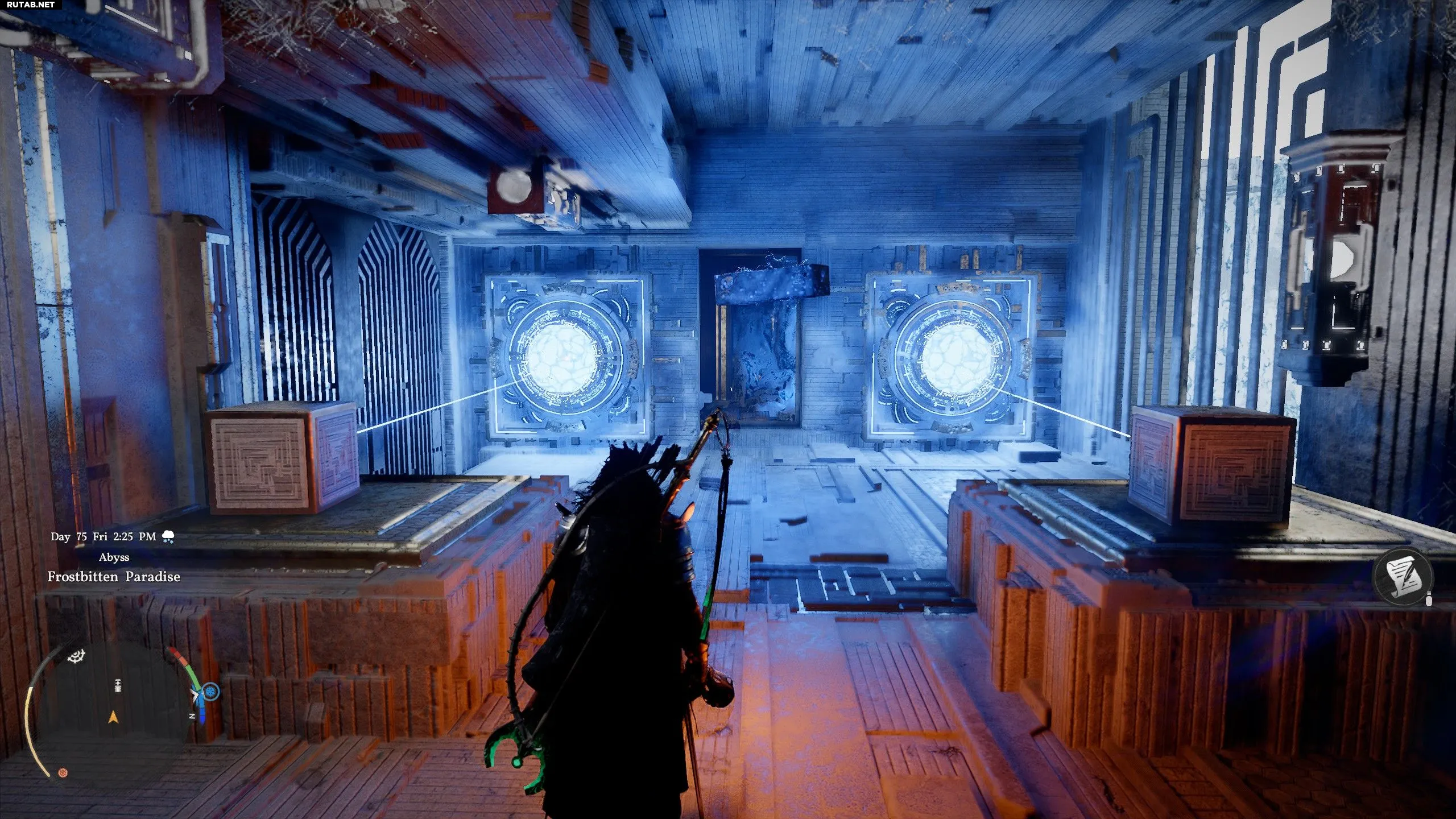 Притяните батарею к закрытой двери с помощью Силы Аксиомы. Используйте «Ослепляющую вспышку» (L1+R1+L1) на жёлтом кристалле, чтобы открыть дверь, и быстро протащите через неё батарею и себя, пока проход снова не закрылся. Протолкните батарею в отверстие в полу и проползите за ней. Поместите батарею в пустой слот на полу в западной части комнаты и ударьте по ней «Ударом ладони», чтобы активировать телепорт.