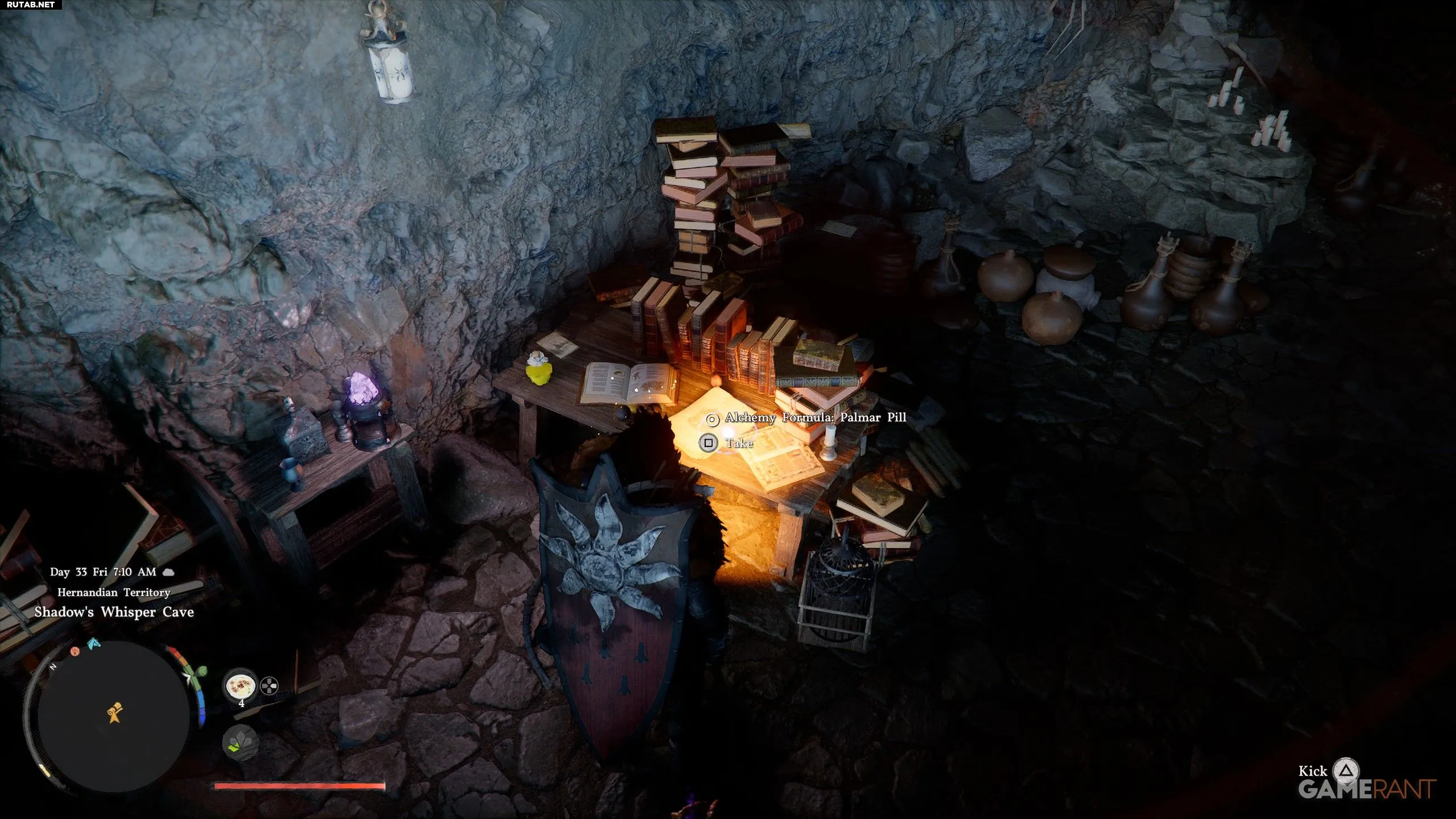 Поднимитесь вверх по течению (на север) в Трёхсвятительском водопаде. Там вы найдёте пещеру в скале слева (она отмечена на карте выше, чуть ниже буквы «D» в слове «Hernand»). Внутри этой пещеры вы обнаружите несколько Палмарских пилюль, но что ещё лучше — чертёж для их создания!