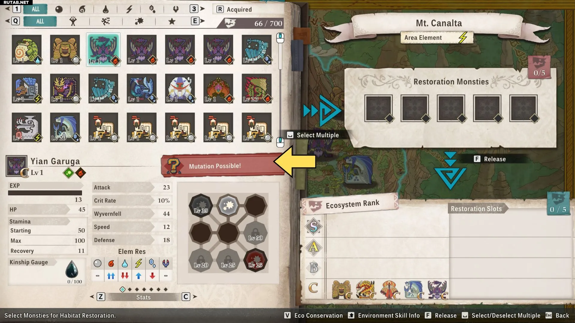 Когда выпуск монстра может привести к мутации, на левой стороне экрана восстановления ареалов появится красная табличка с надписью «Возможна мутация». После выпуска монстров и просмотра новых уровней экосистемы появится слово «Мутировал» с иконкой, представляющей нового монстра. Игроки также получат уведомление с именем нового монстра, сообщающее, что он теперь присутствует в регионе.