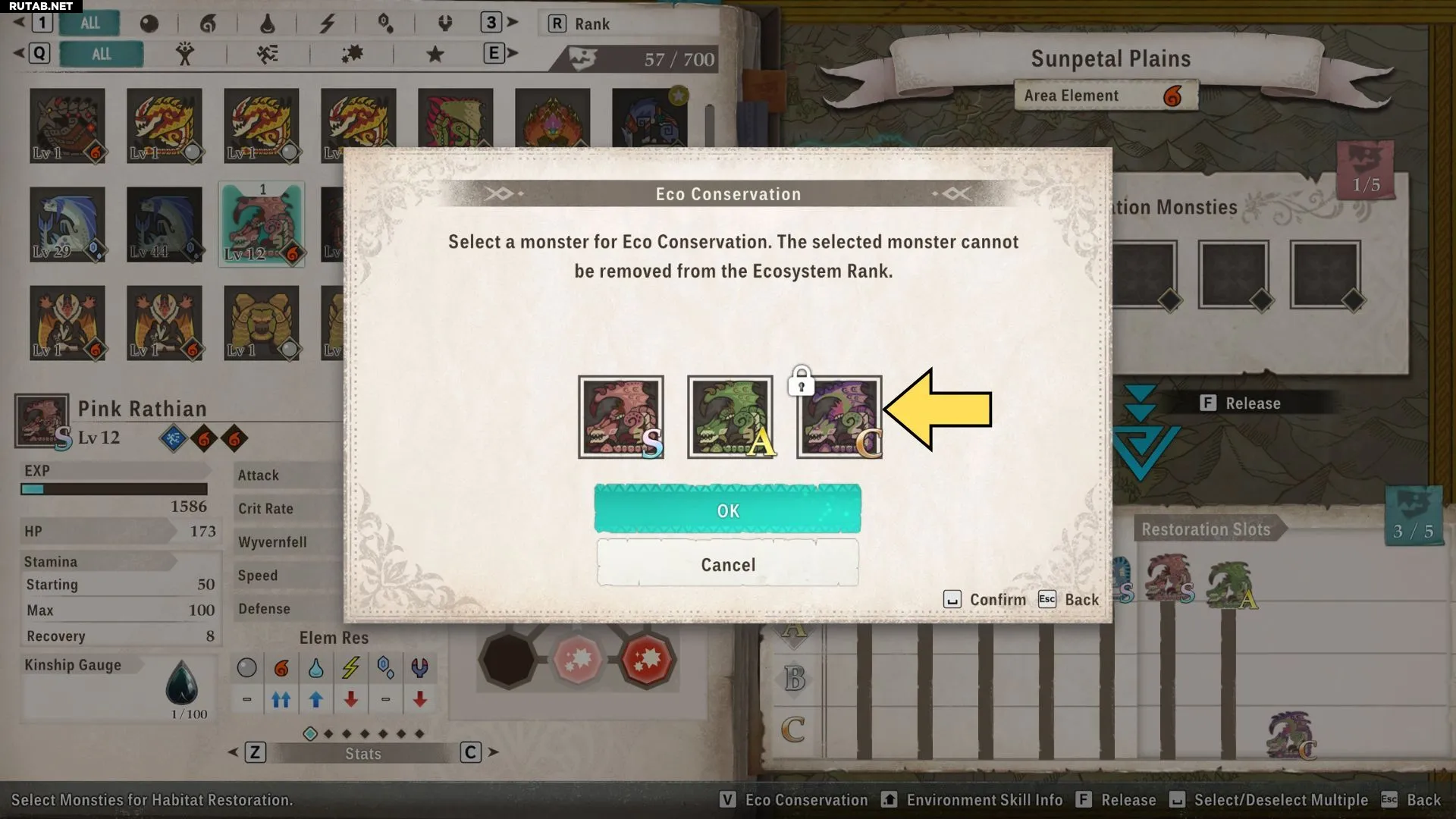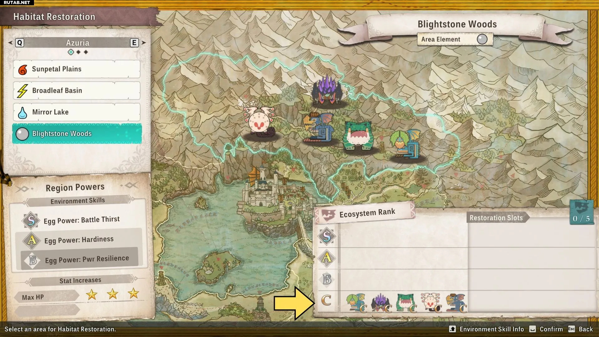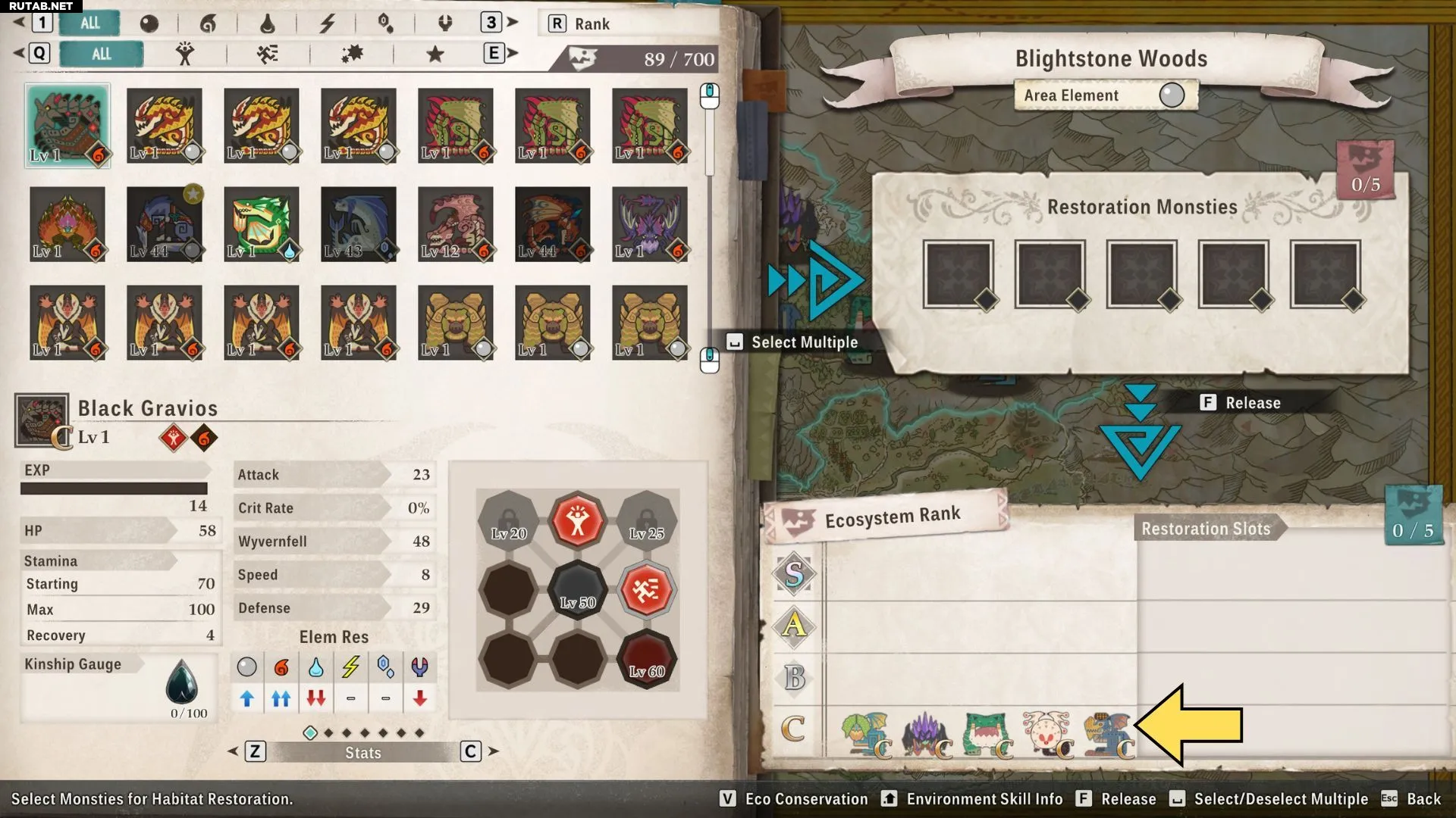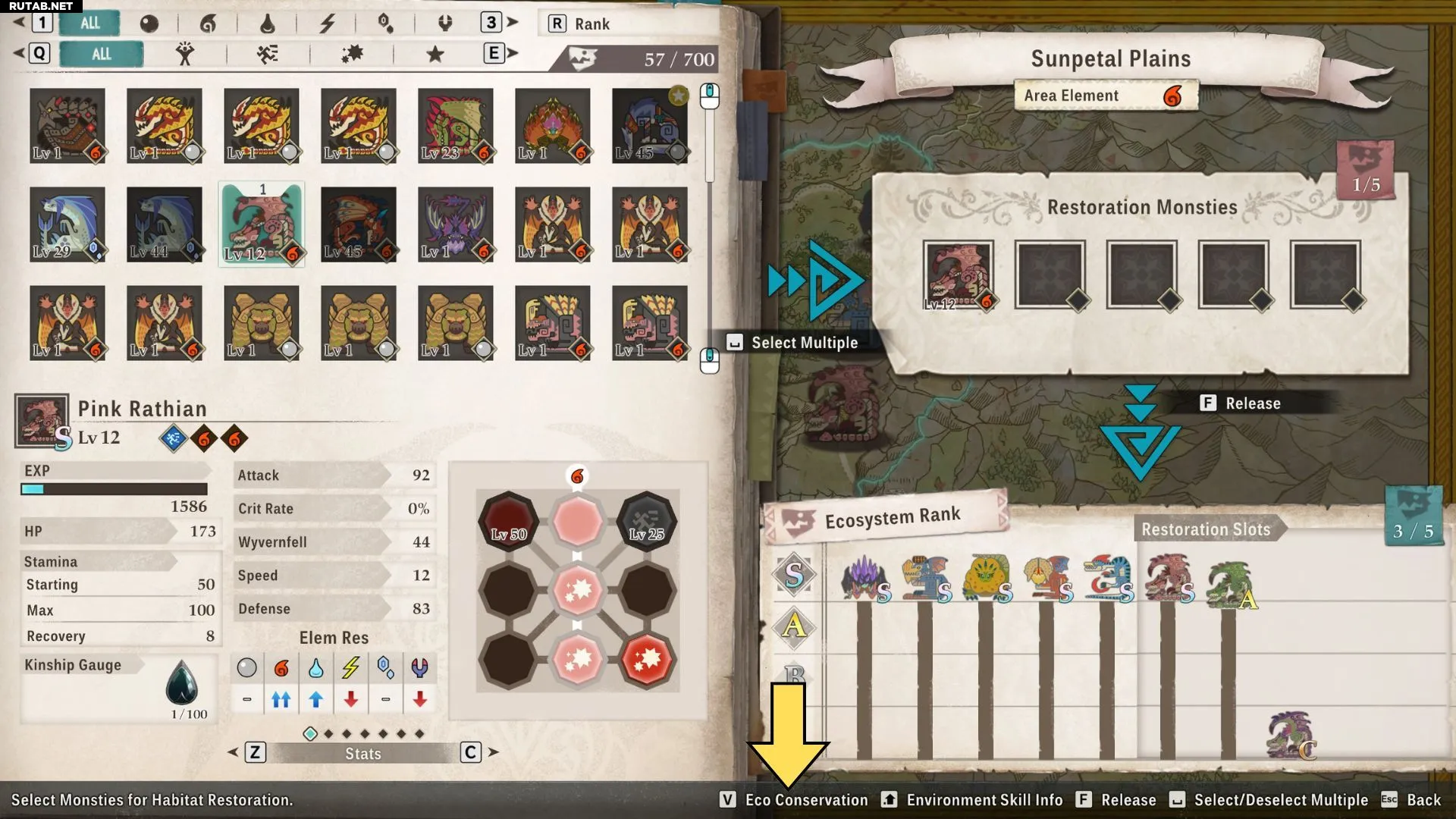 Чтобы выпустить монстров, отправляйтесь в любой лагерь, войдите в него и выберите опцию «Восстановление ареалов». После выбора области для восстановления посмотрите в правый нижний угол экрана, чтобы увидеть монстров, обитающих в этой области, и их уровень экосистемы.