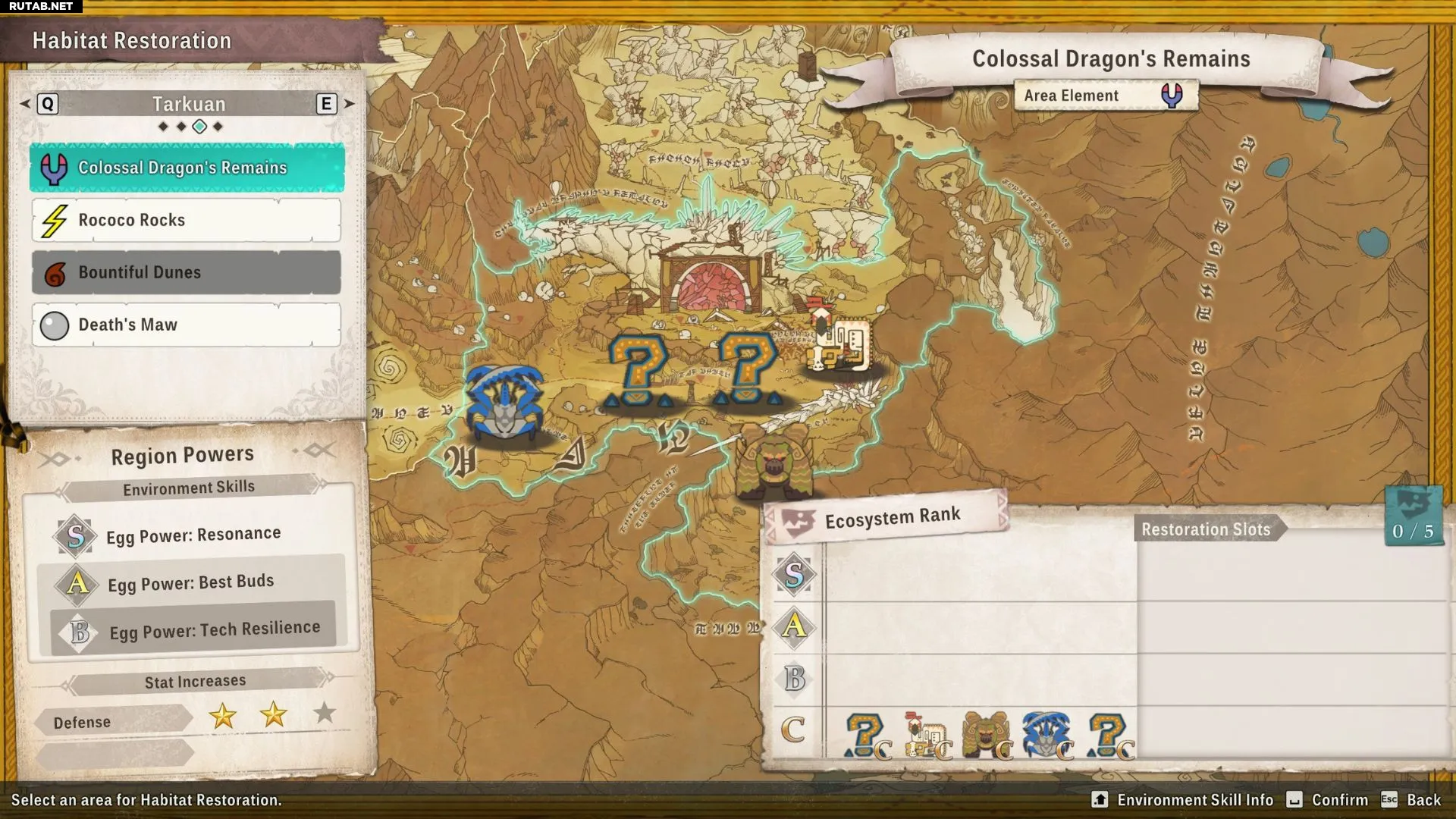 Монстры, вылупившиеся из яиц, найденных в Таркуане, или отправленные туда на экскурсию, получат увеличение показателя защиты. Способности яиц этого региона сосредоточены на улучшении шкалы родства и снижении урона от атак типа «Техника».