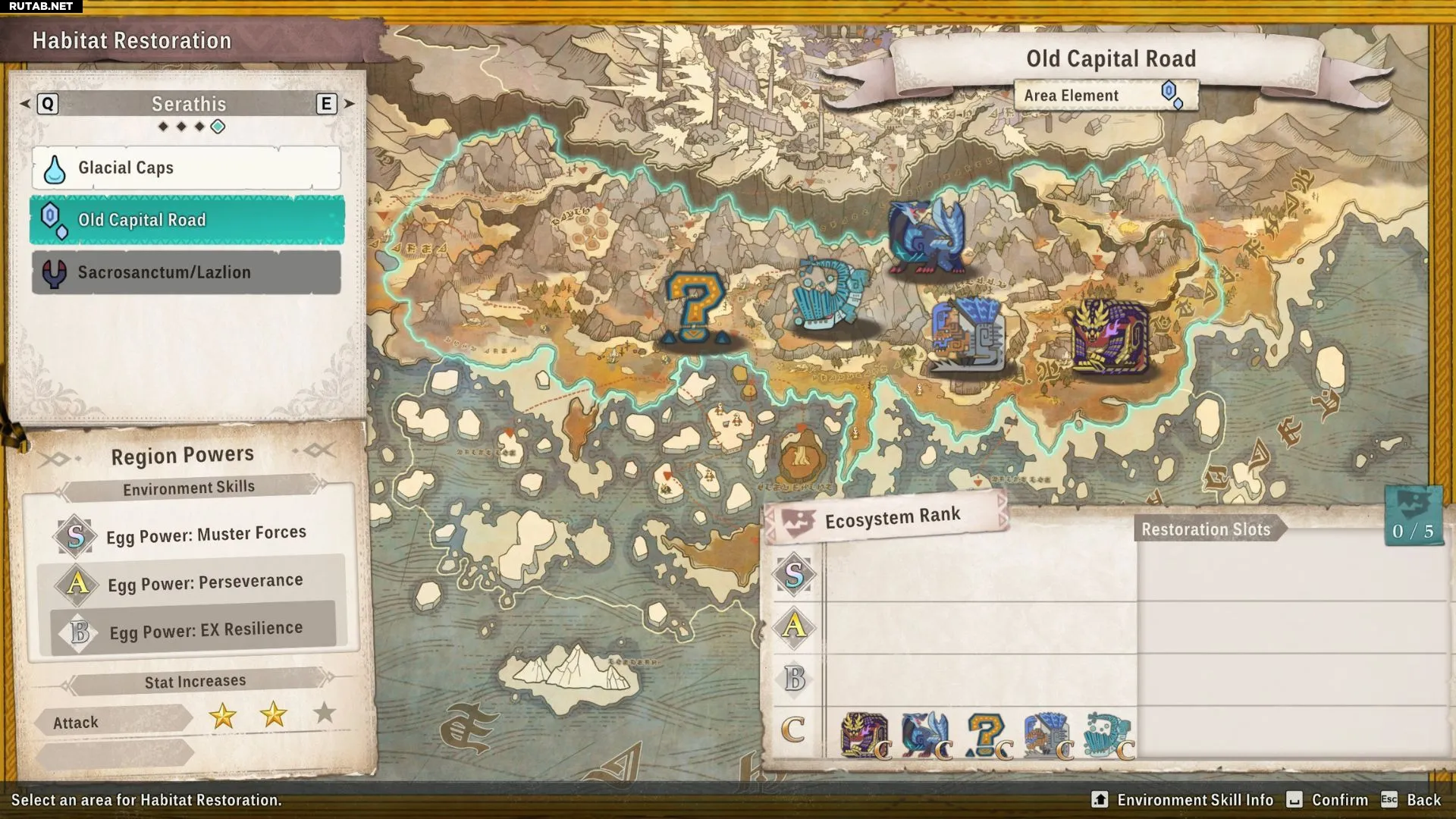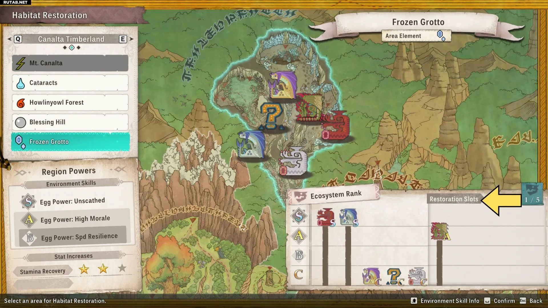 Хотя в каждом регионе обитает пять видов монстров, там также есть пять слотов восстановления. Эти слоты позволяют игрокам выпускать монстров в регионы, где они изначально не водятся. Сюда входят как редкие виды, вроде Ратиан, так и любые монстры из других регионов, не являющиеся местными для этой области.