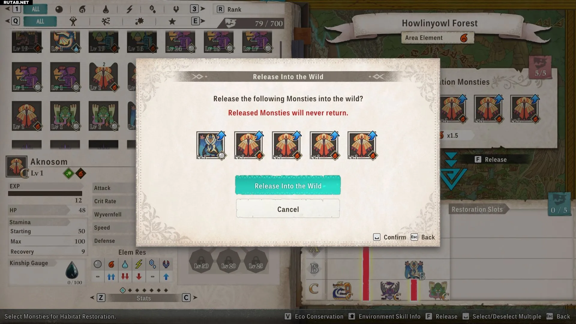 Если выбрано четыре или меньше монстров, их можно выпустить, нажав клавишу F. Если выбрано 5 монстров, откроется небольшое окно для подтверждения выбора. Нажмите кнопку «Выпустить в дикую природу» в этом окне, чтобы завершить действие.