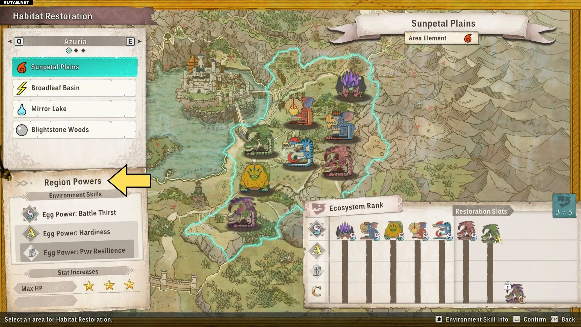 Каждый регион имеет несколько навыков окружения, также известных как способности яиц, которые разблокируются по мере повышения уровней экосистемы монстров в этом регионе и тех, что находятся в вашей группе.