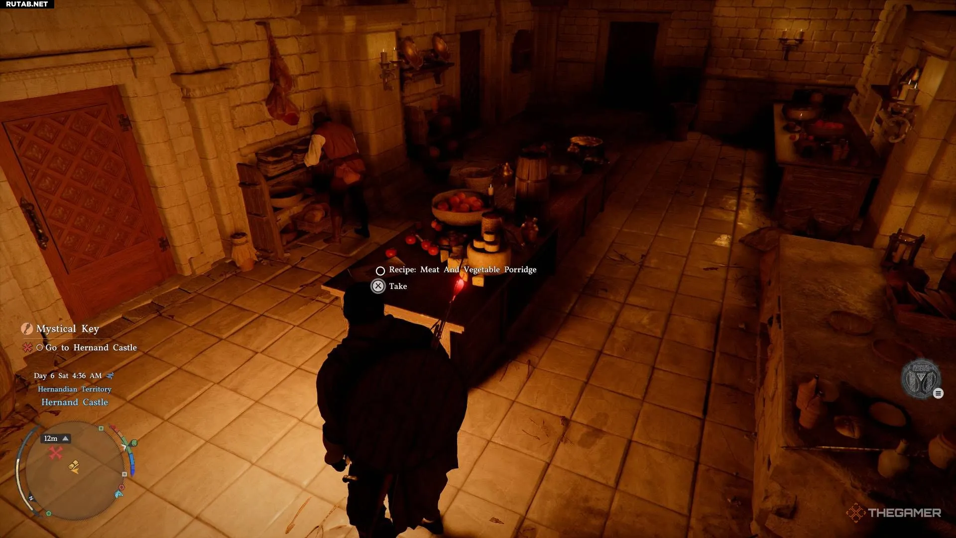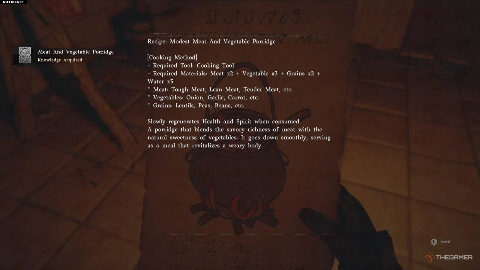 Рецепт мясо-овощной каши можно найти на кухне замка Хернанда в ходе выполнения основного сюжетного задания «Первая встреча». Получив доступ в замок, поверните направо на кухню и подберите рецепт.