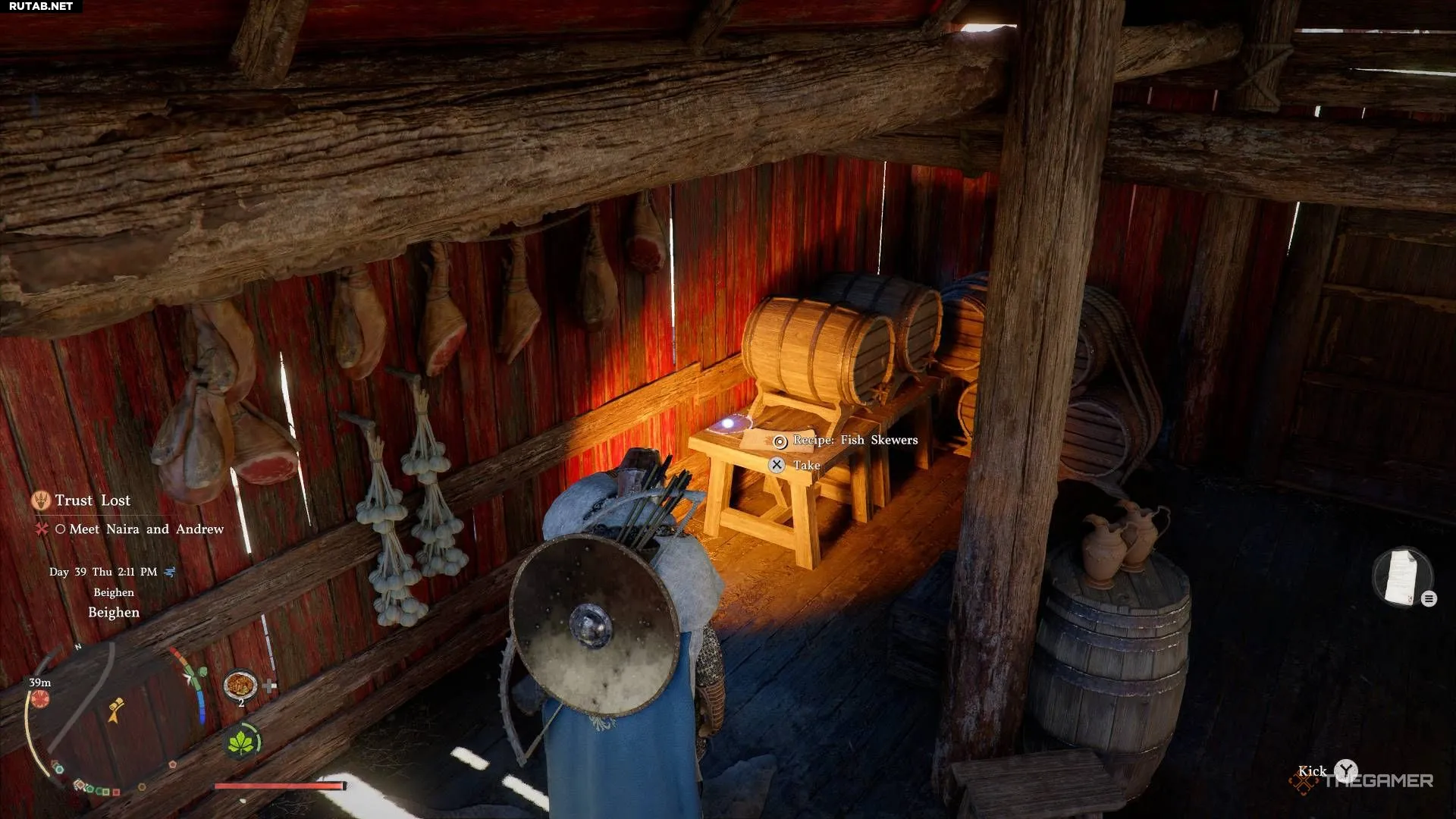 Рецепт рыбных шашлычек можно найти в питейном зале в Бейгене. Это не отмеченная точка интереса, но он находится рядом с местом, где вы разговариваете с важным NPC. Зайдите в здание, рецепт лежит в глубине, на столе.