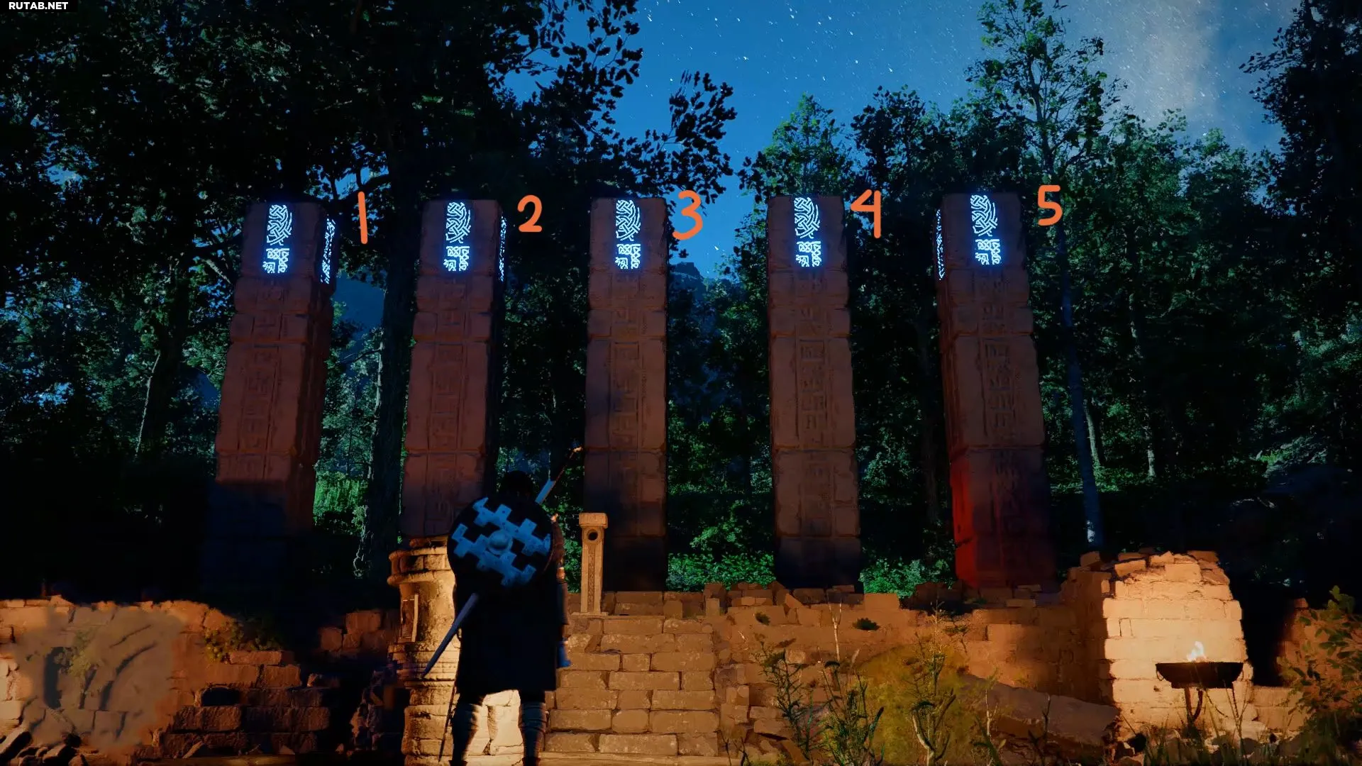 Чтобы увидеть, какая колонна активна, и переместить их, нужно ударить по механизму с помощью соответствующего навыка. Решение головоломки выглядит так:
