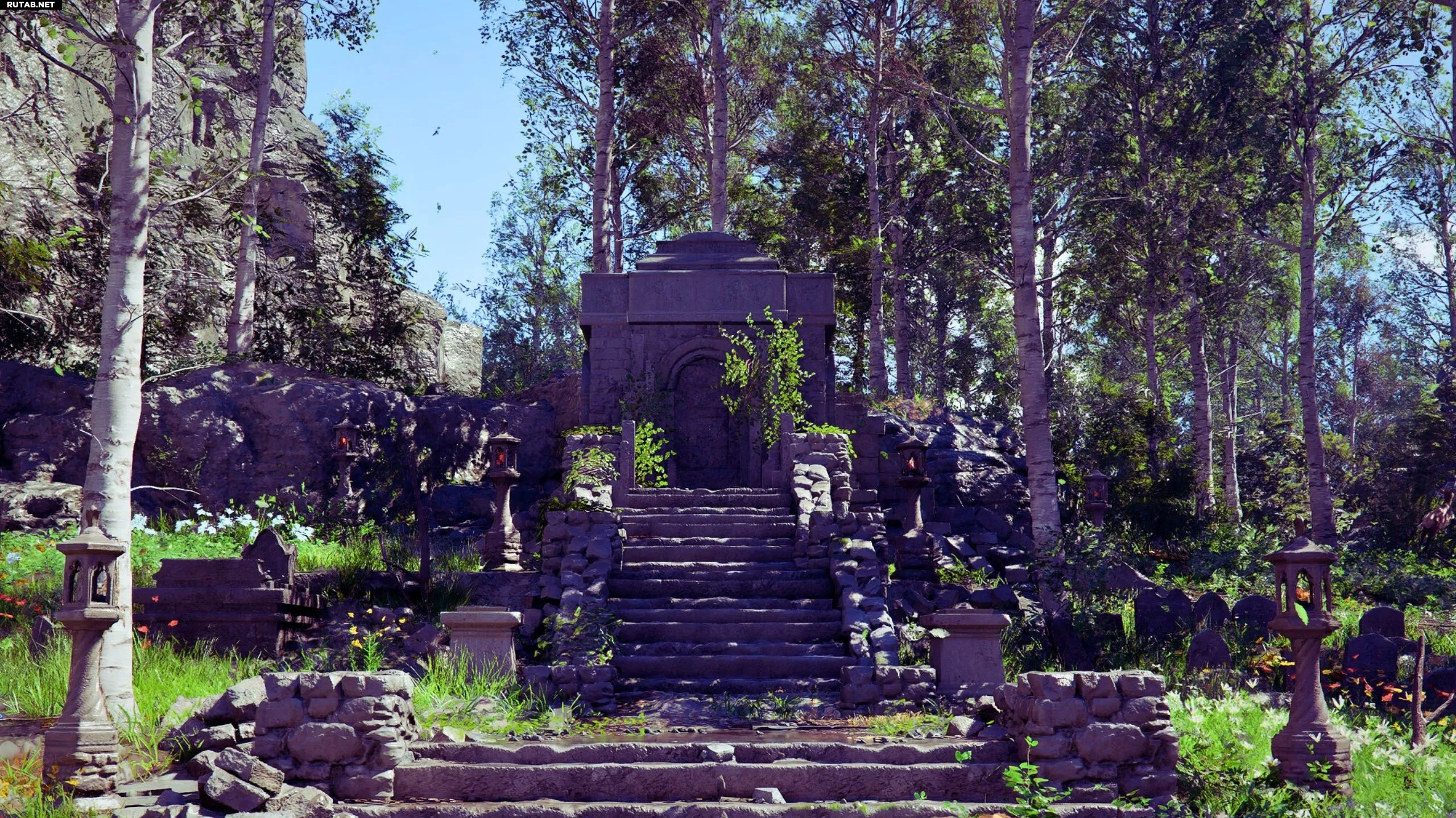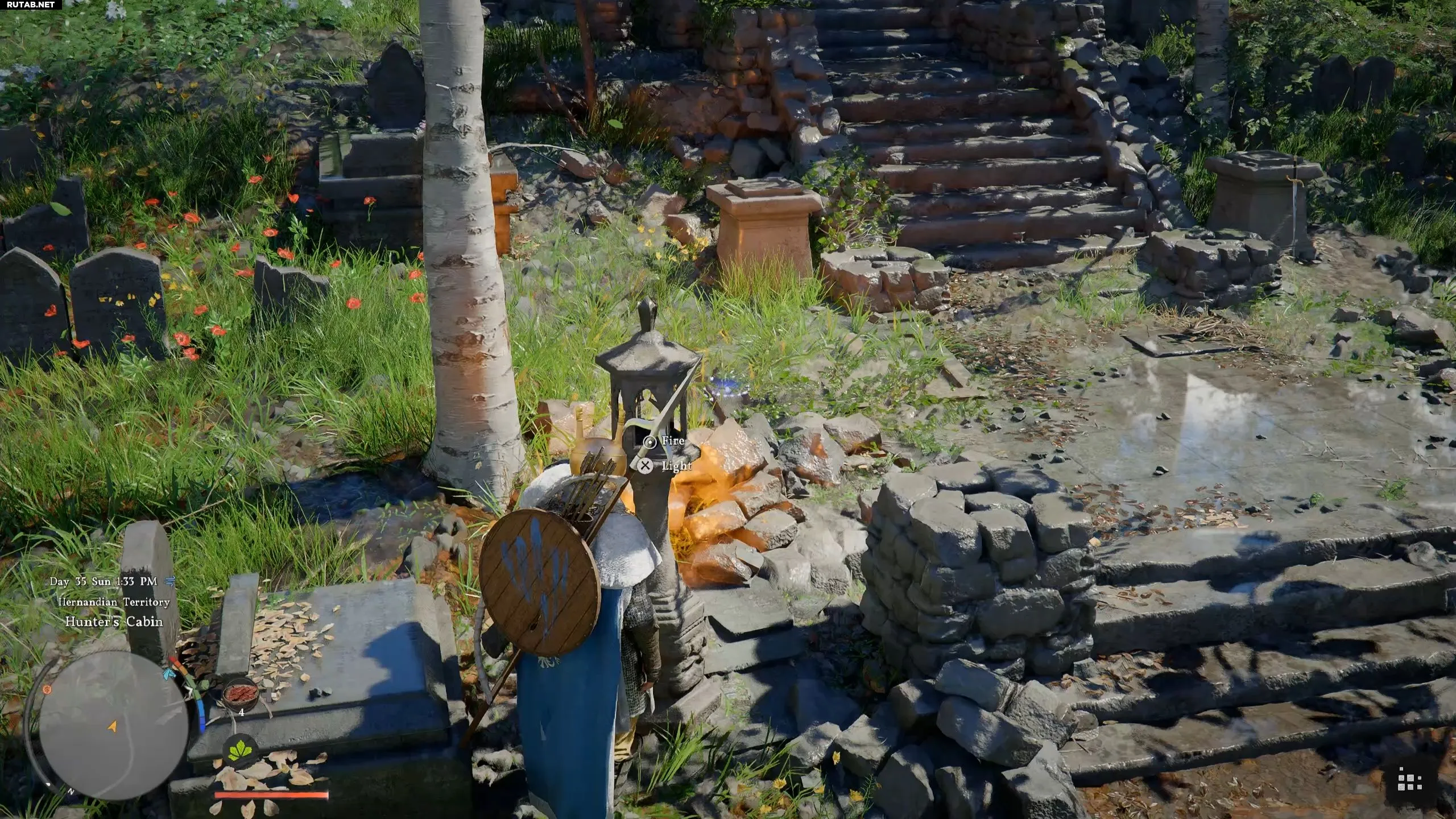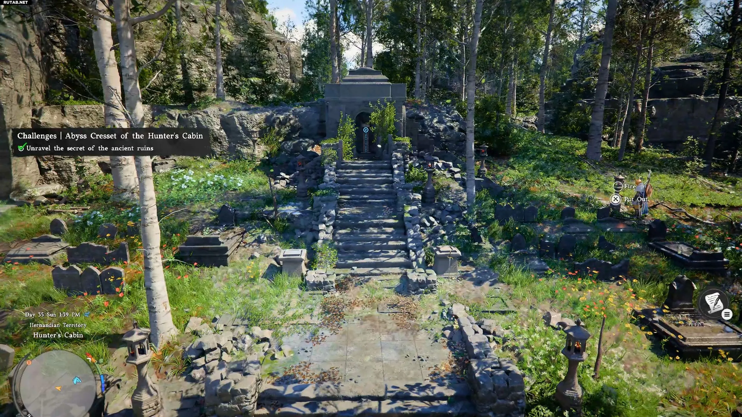 Чтобы решить загадку кладбища у Охотничьей избушки, нужно зажечь все каменные фонари вокруг могил. Некоторые из них уже горят, остальные необходимо активировать вручную, взаимодействуя с ними.