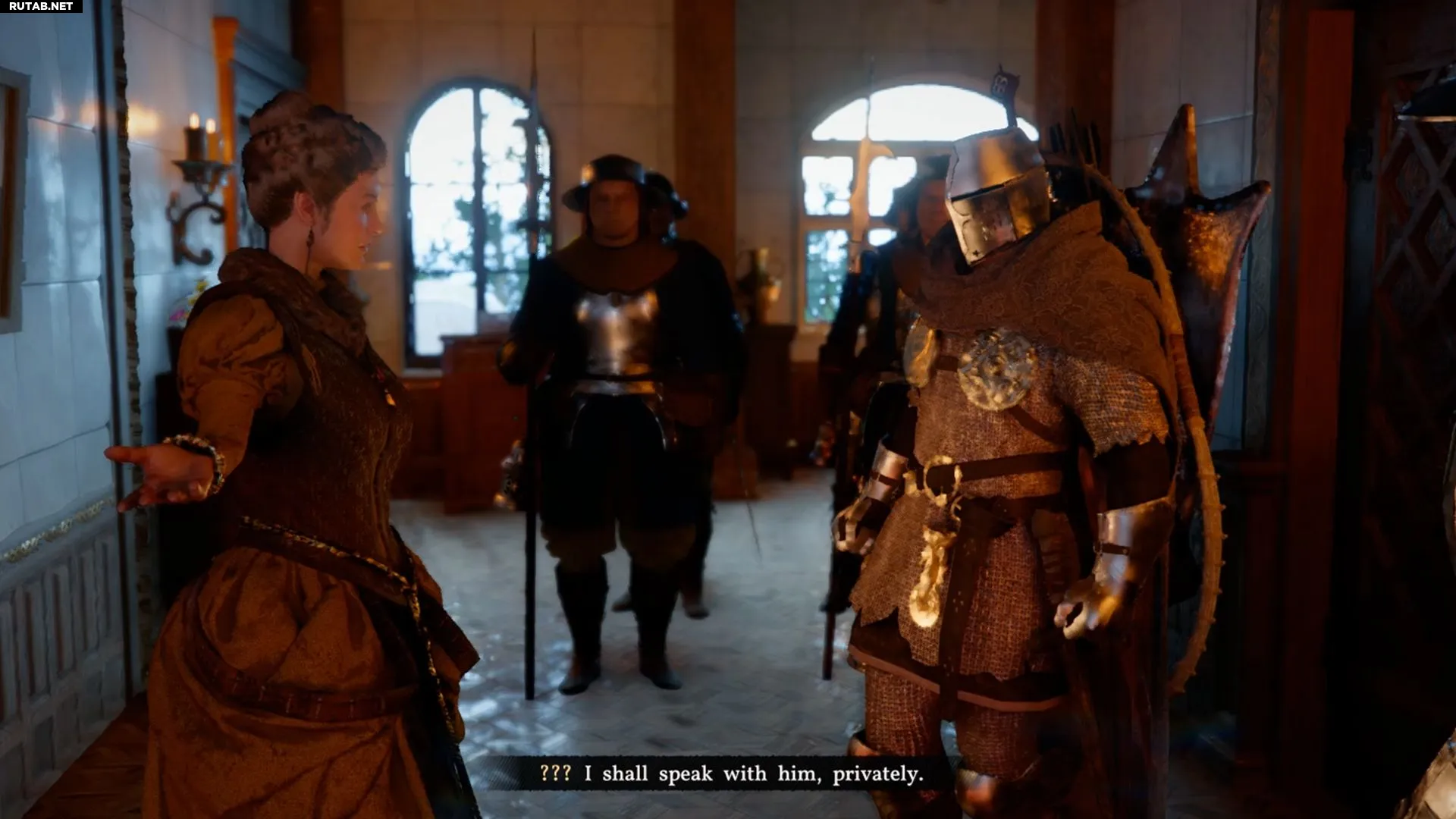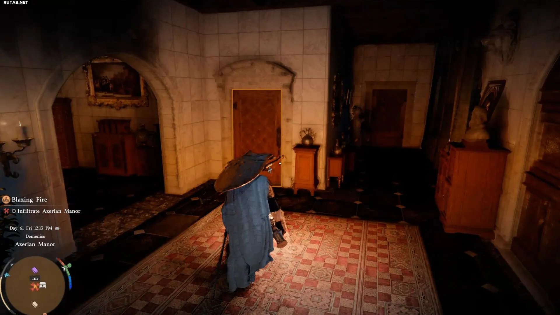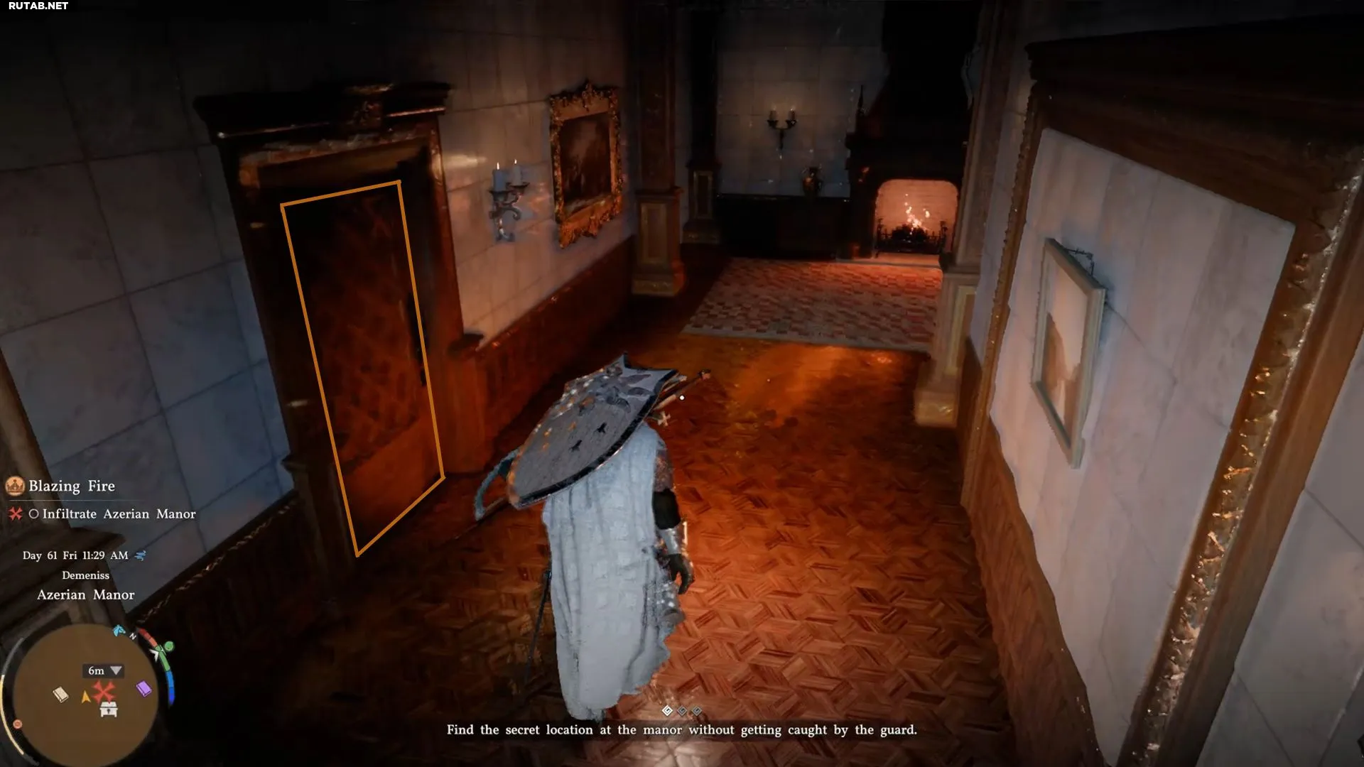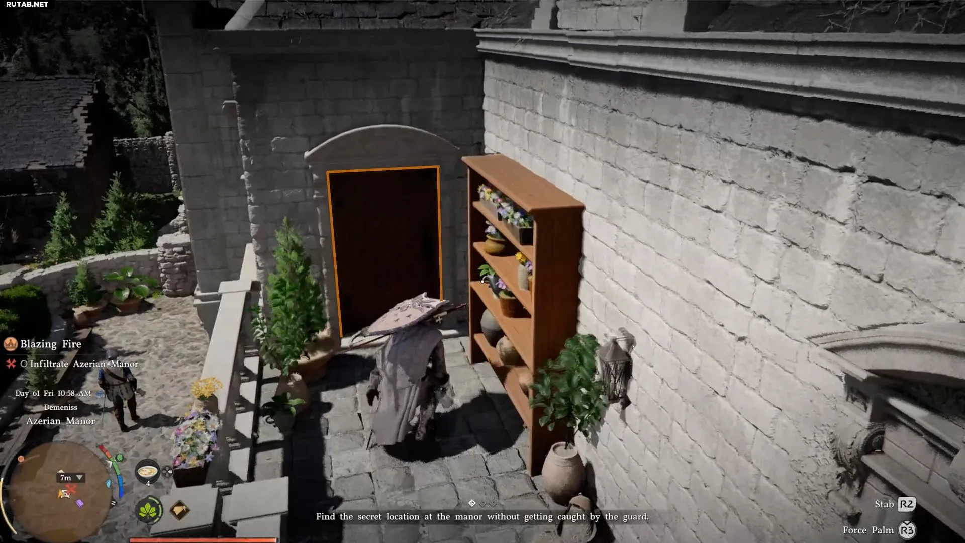 Внутри не придется долго искать: сразу справа вы увидите подозрительную стену. Это и есть тайное место в поместье, которое Клифф должен найти, не попавшись стражникам.