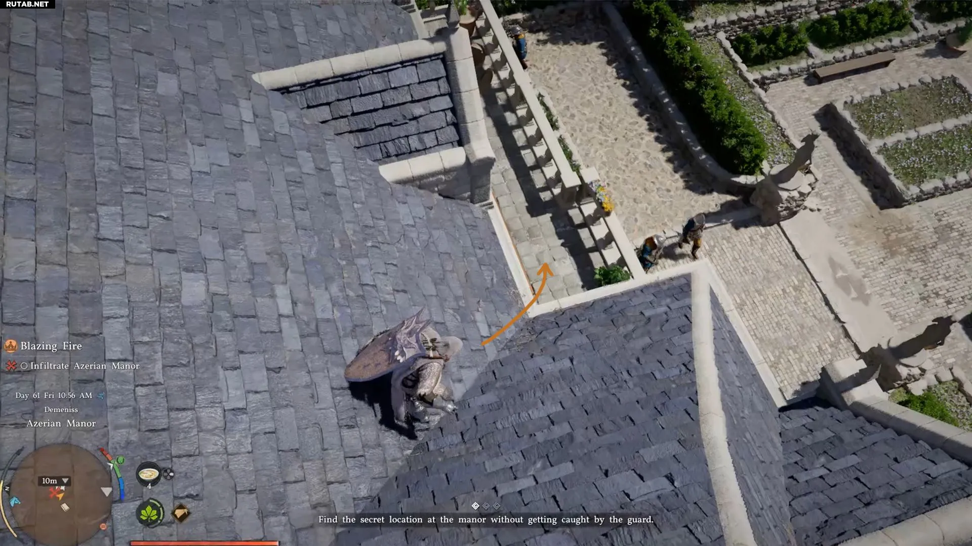 Оказавшись на крыше, найдите балкон с лицевой стороны поместья и спрыгните на него.