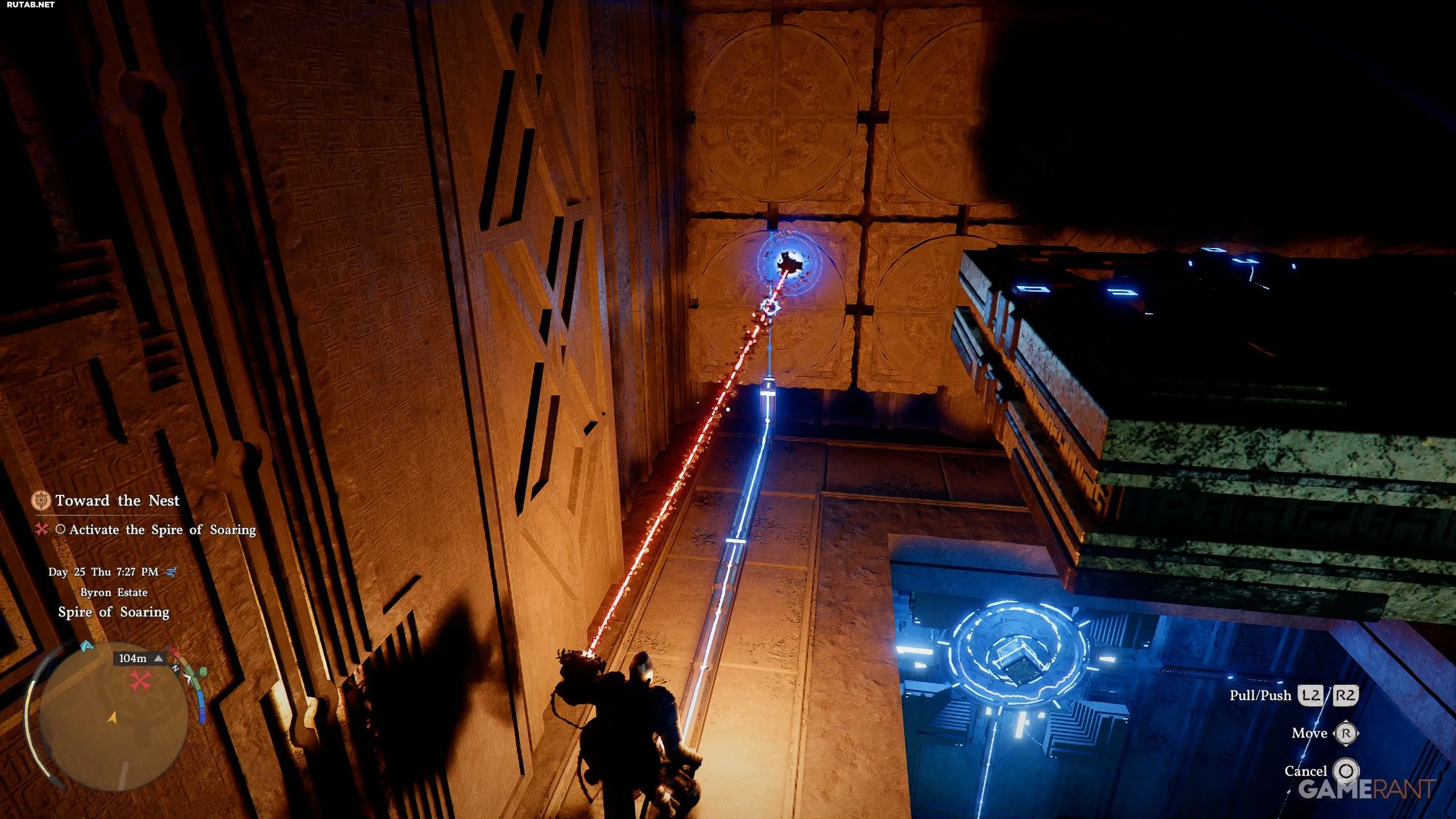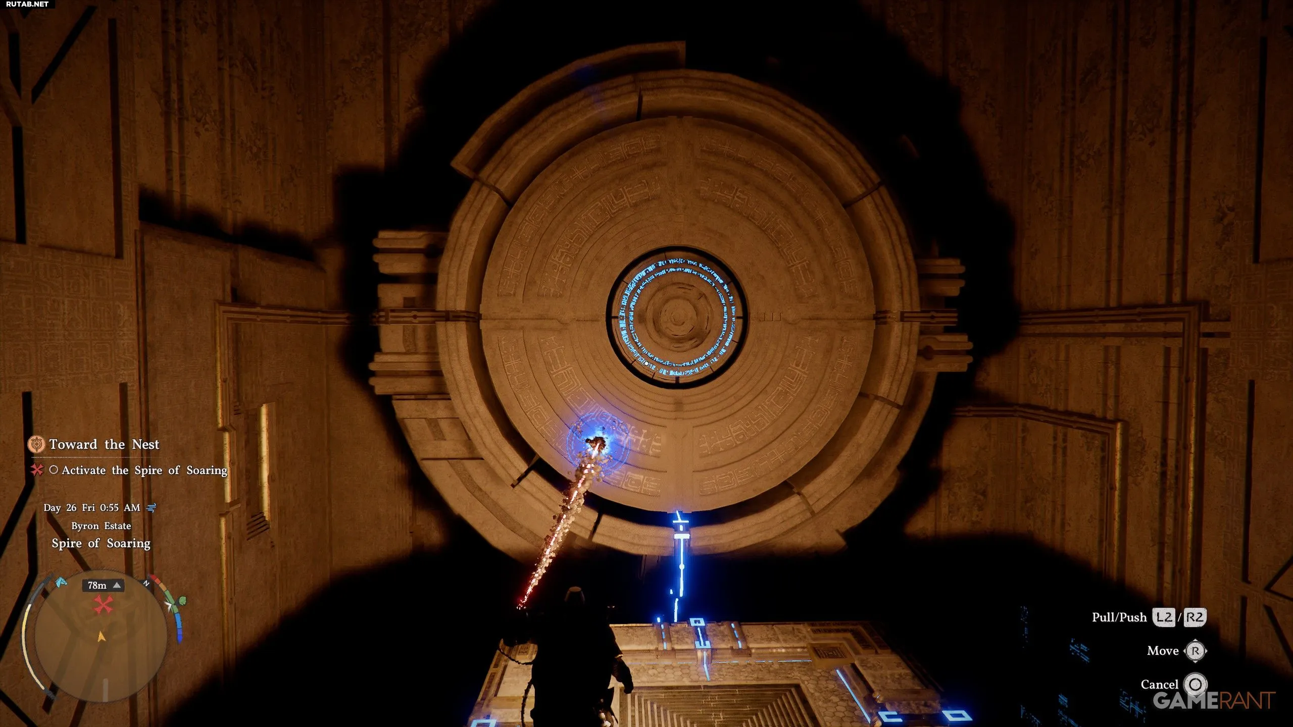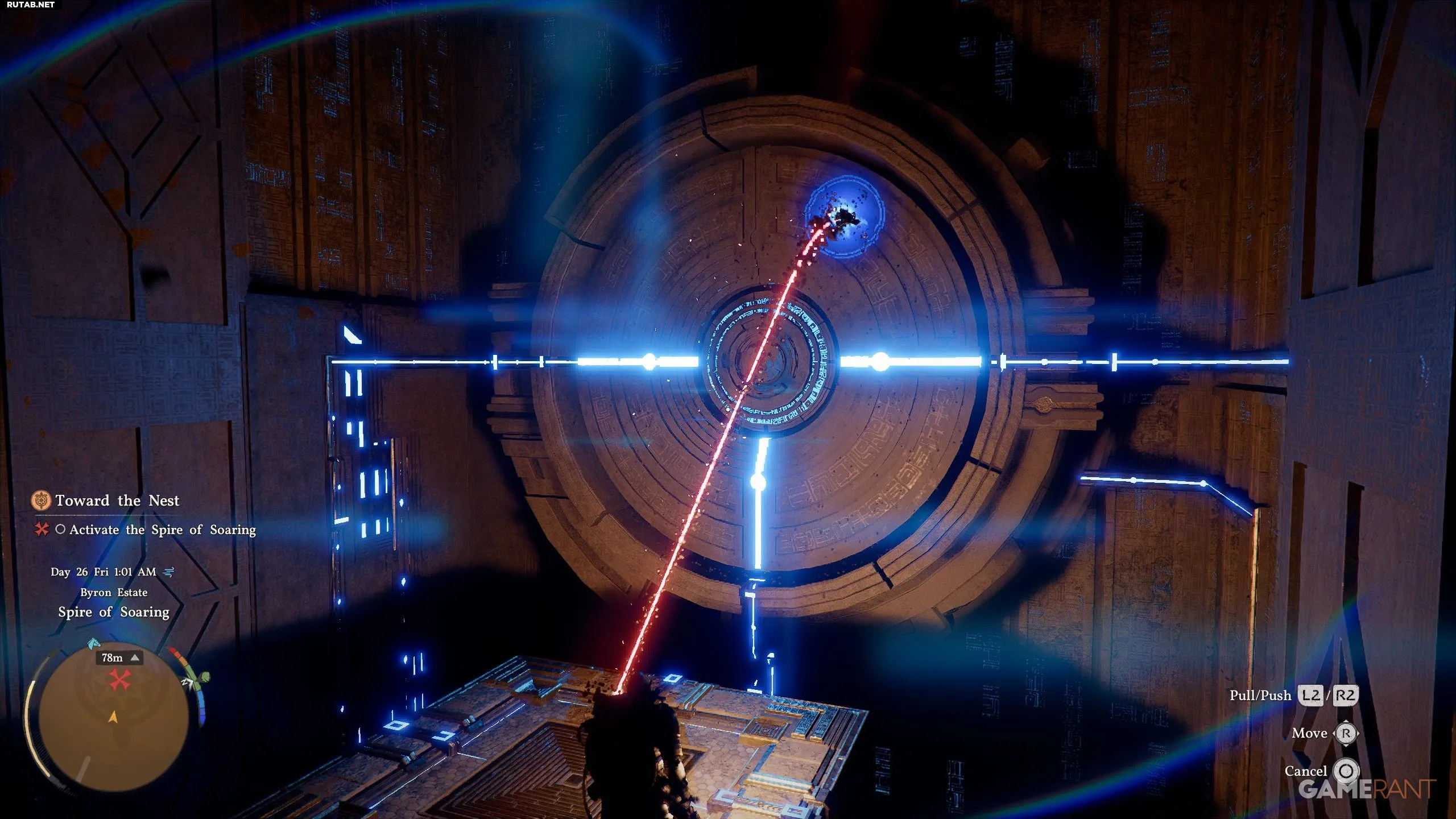 - Используйте L2/R2, чтобы тянуть или толкать платформу, пока она не начнёт светиться синим и не активирует подъём лифта.