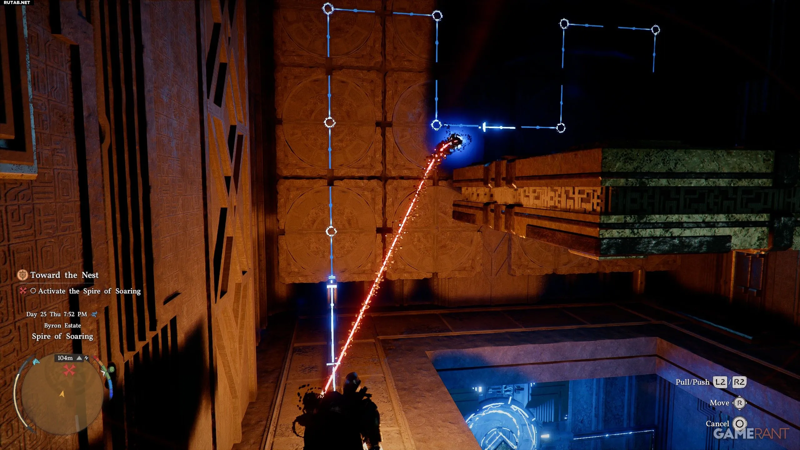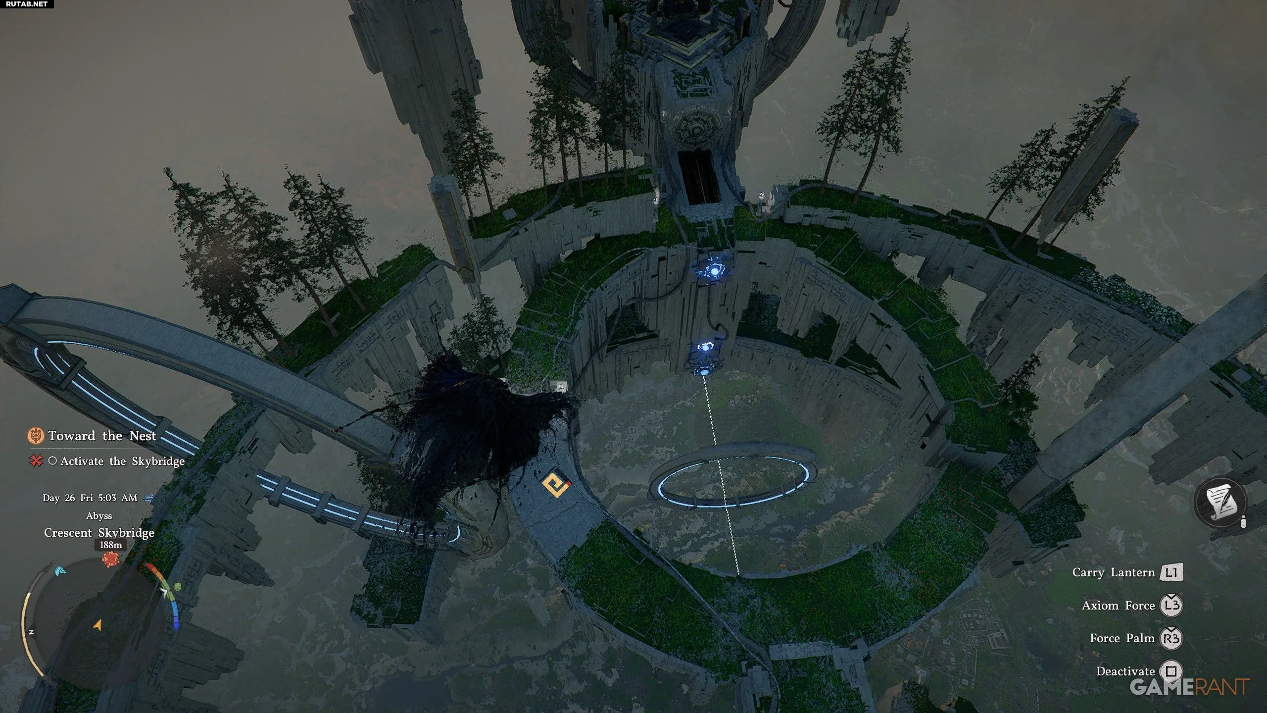 - Используйте L3, чтобы активировать Силу Аксиомы на левой платформе, и потяните её, чтобы соединительная синяя линия пошла вверх.
