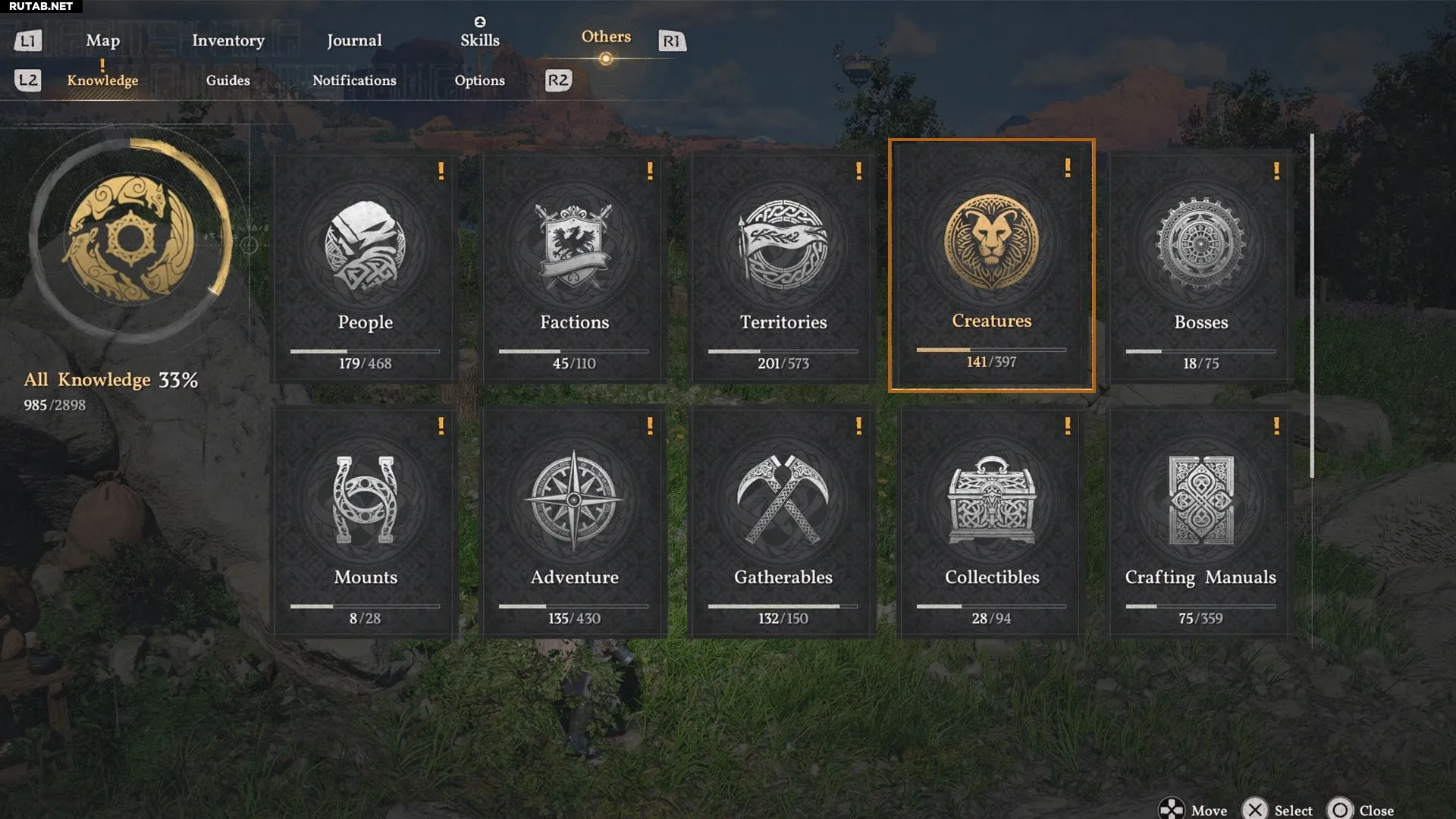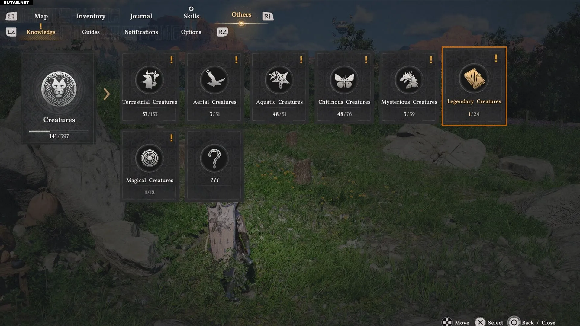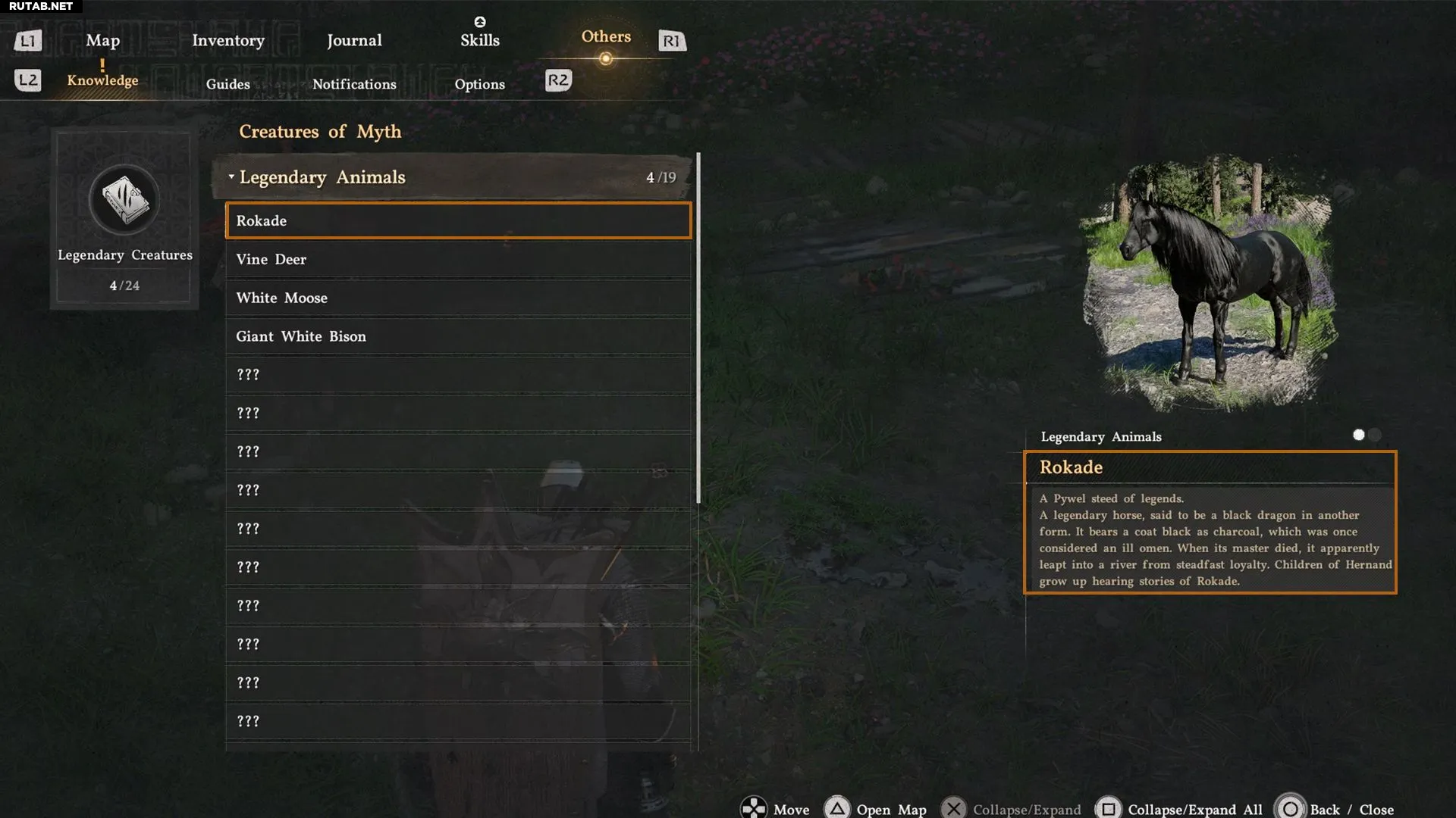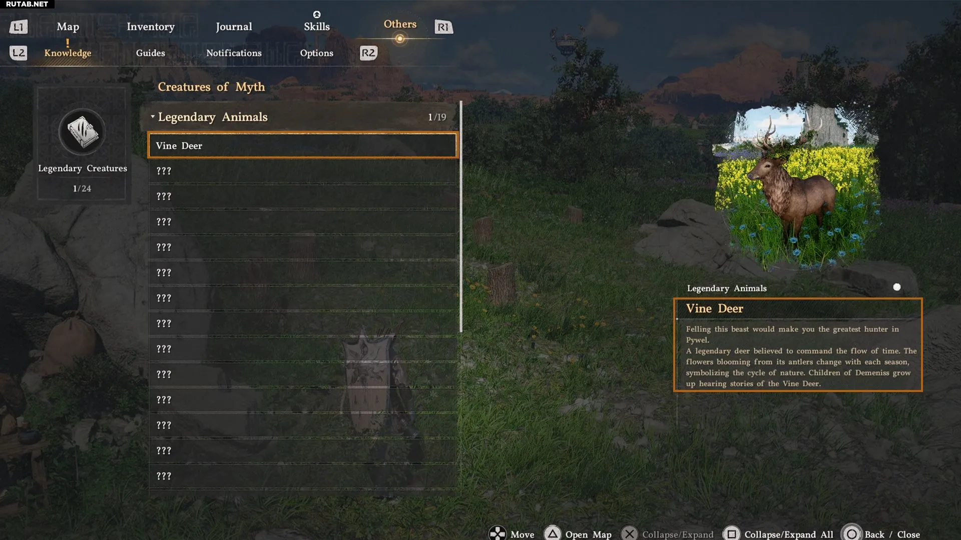 Из этой вкладки вы можете узнать всё о полученных легендарных существах и об их особенностях, что является надежным способом их найти. Например, Виноградный олень — это легендарное существо, у которого из рогов растут цветы, и они меняются с каждым сезоном. Поэтому, пытаясь найти Виноградного оленя в стаде, проверяйте их рога, и его будет легче заметить.