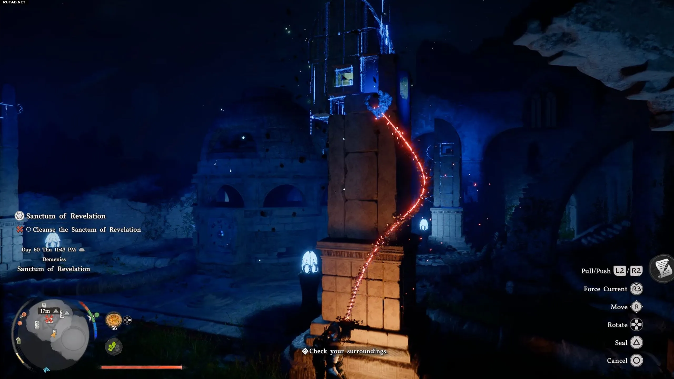 Продвигаясь вверх по зданию, вы встретите босса — Копьё Антумбры. Этот противник будет появляться в разных святилищах. Его атаки предсказуемы, а для оглушения на несколько секунд можно использовать «Силовую ладонь». После победы над боссом и уничтожения большинства врагов зелёная шкала опустеет, что ознаменует освобождение святилища.