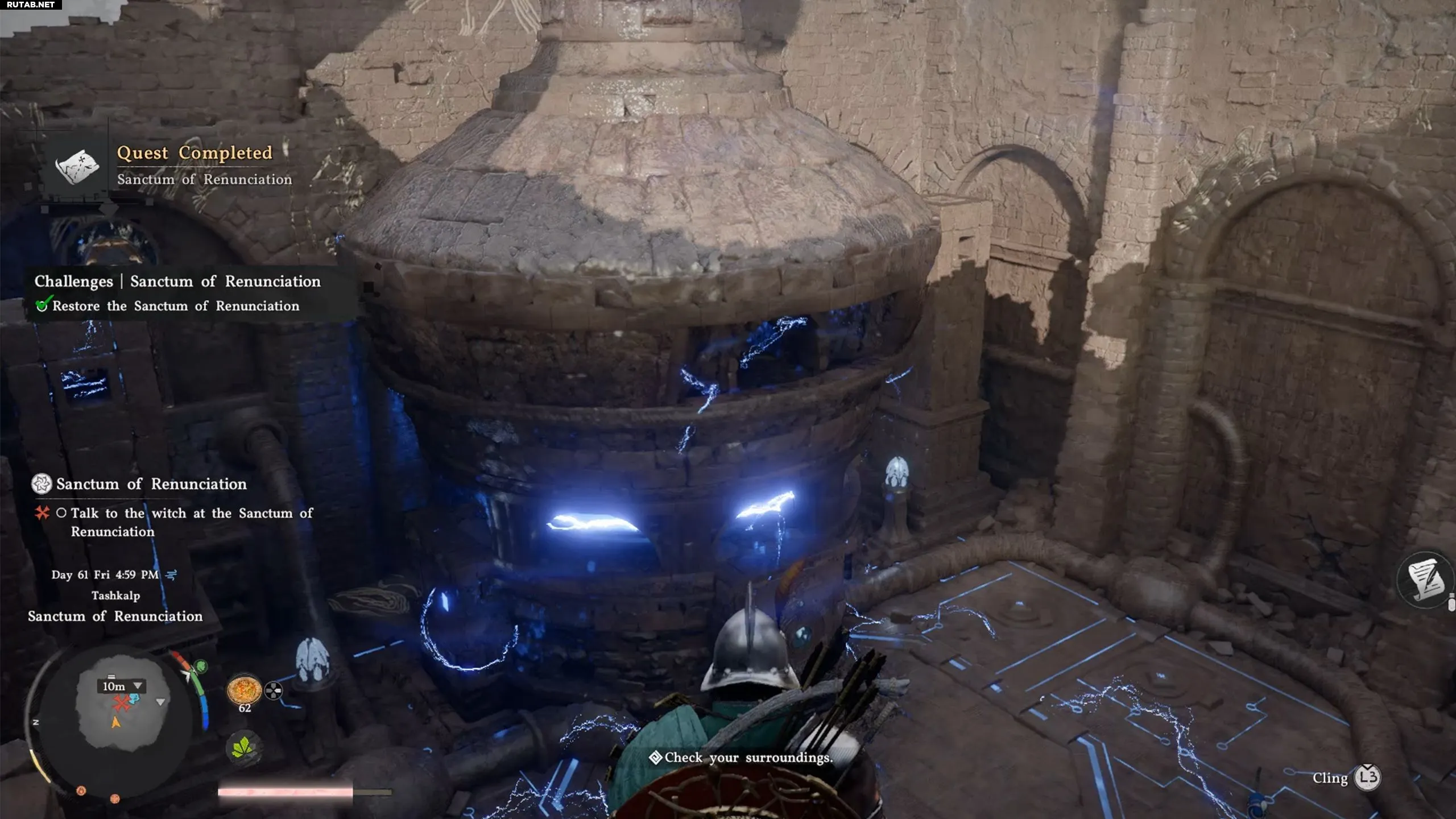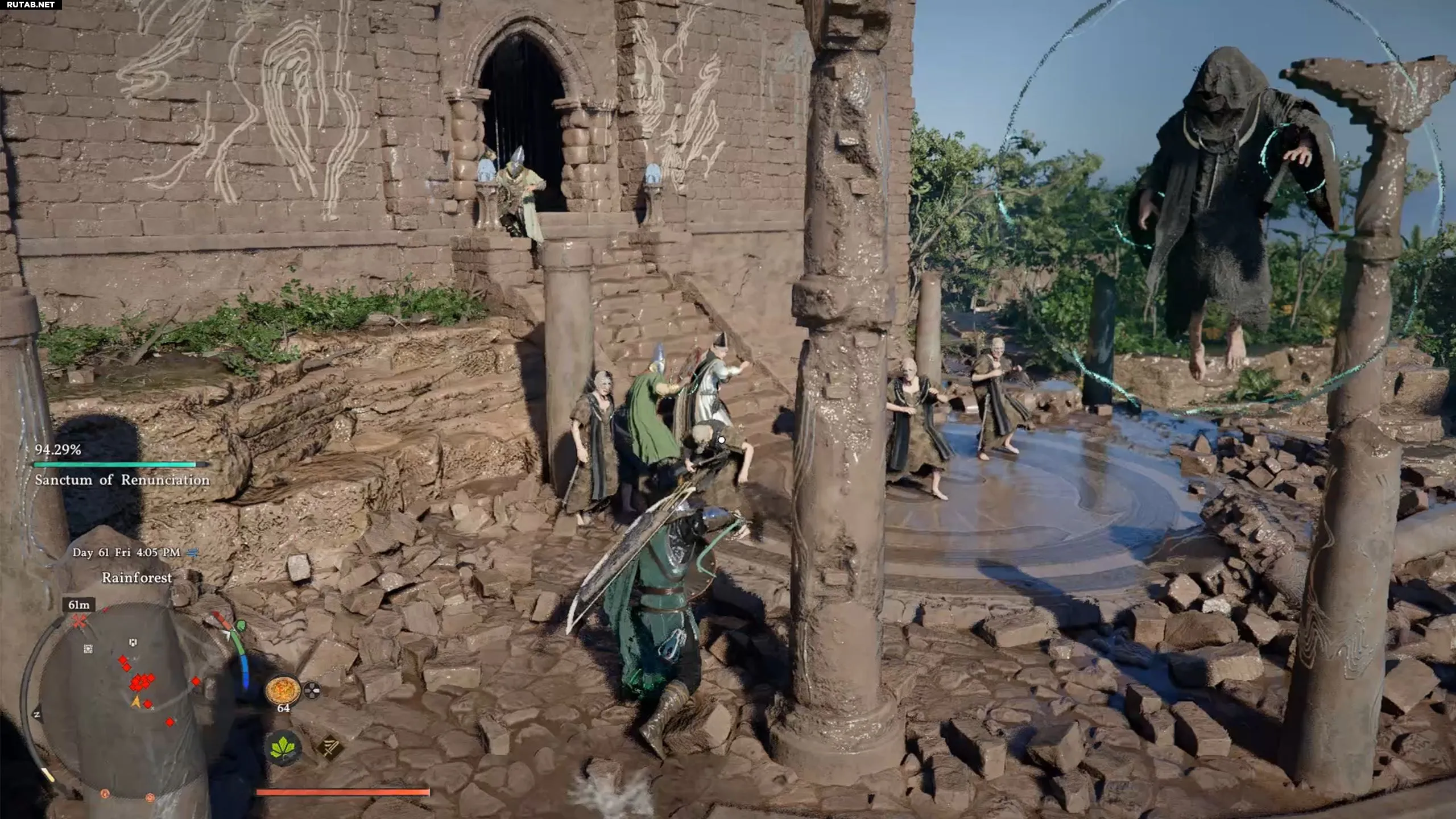 Перед входом будьте готовы к бою. Локация окружена и заполнена культистами. Вам нужно победить всех врагов, чтобы зелёная полоса над картой опустилась до 0%. Это освободит святилище. Если мешают летающие культисты, сбивайте их стрелами, а затем добивайте в ближнем бою.
