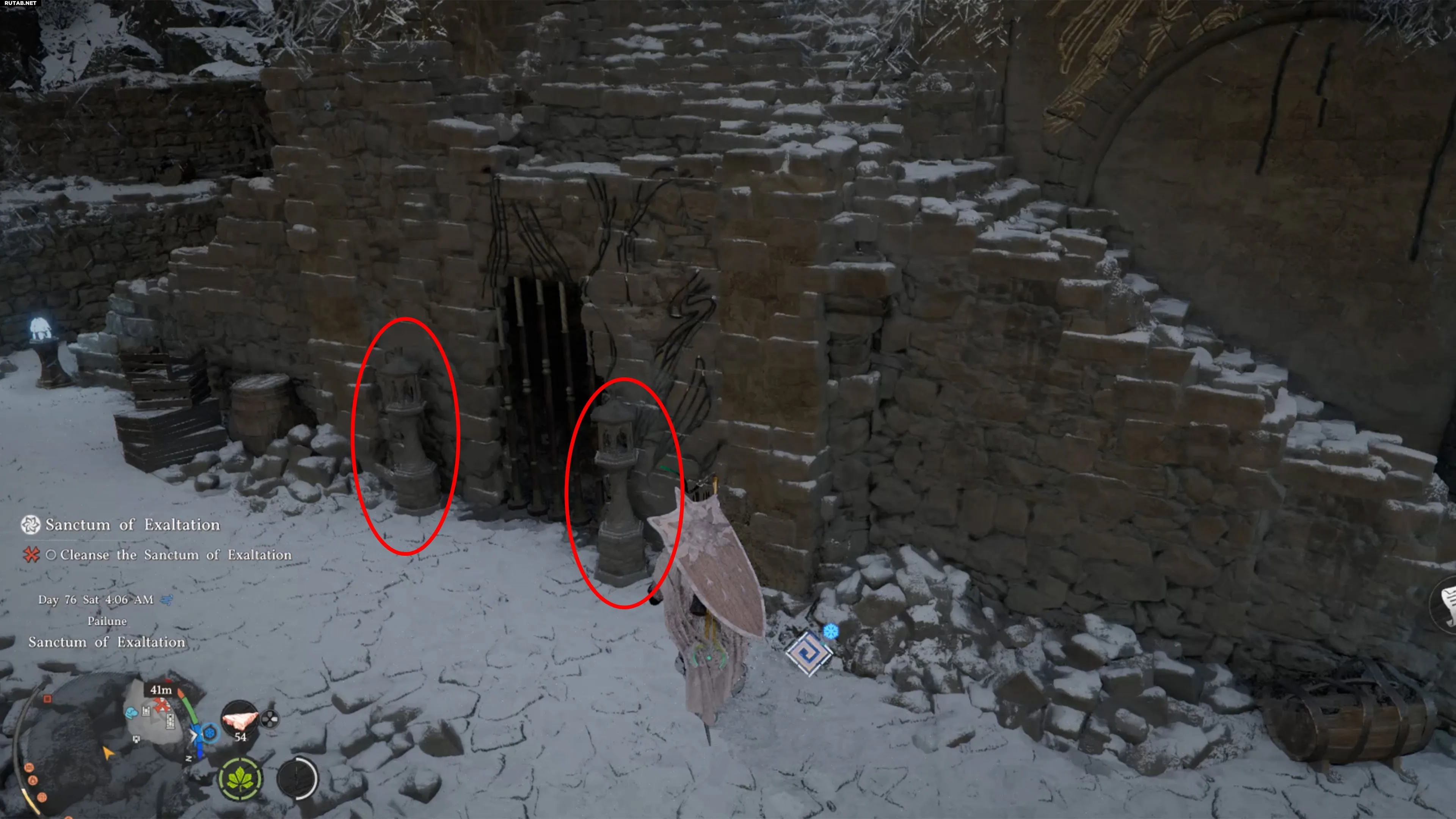 Не уходите, не забрав сундук с сокровищами из запечатанной комнаты слева от кристаллизованной воды (прямо под лестницей). Чтобы открыть ворота, зажгите два фонаря.
