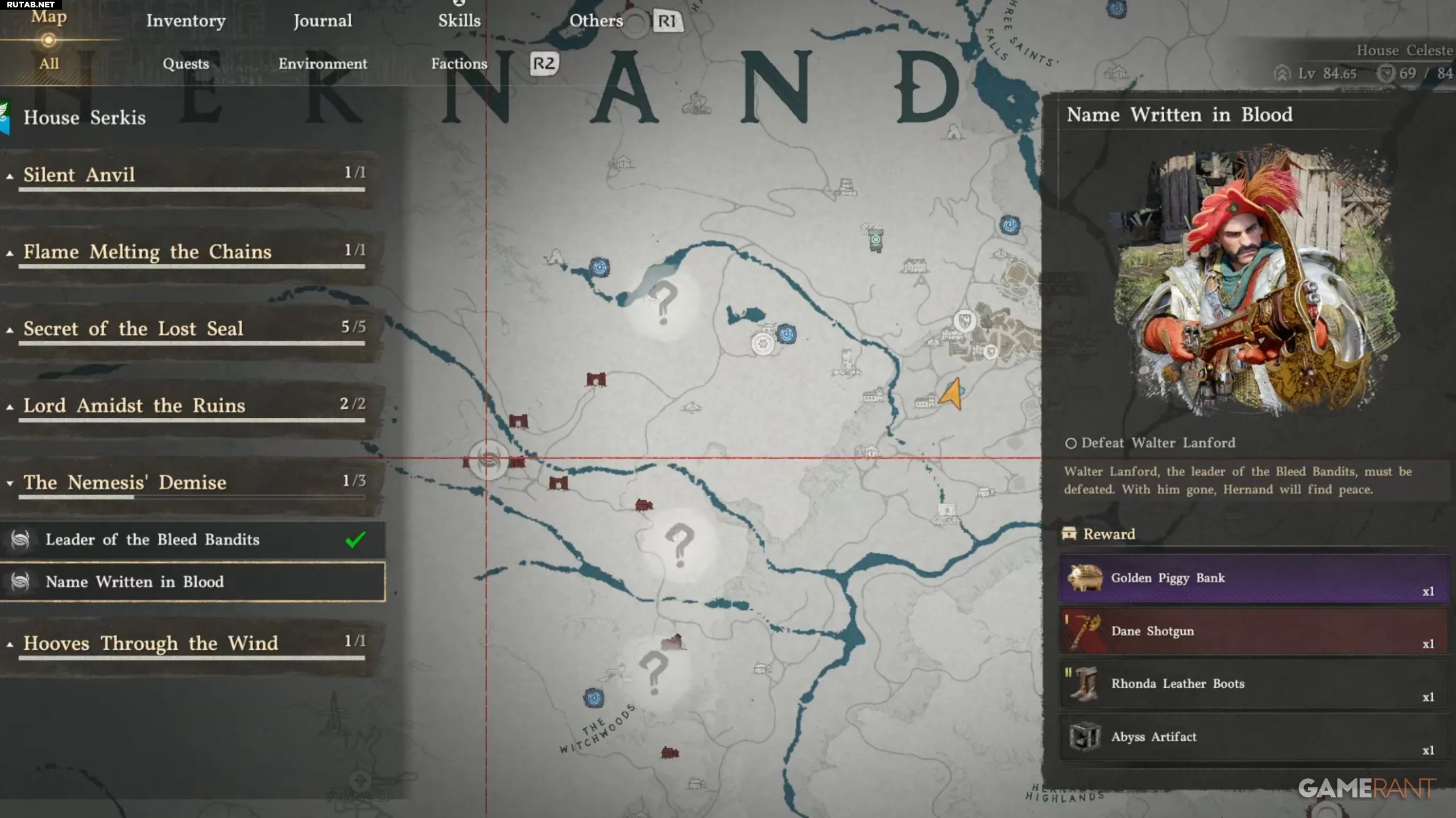 - Если вы выполнили задания Дома Серкис, но у вас нет квеста «Гибель Немезиды», попробуйте выполнить другие фракционные задания в Хернанде или освободить лагеря от бандитов из банды «Кровавый след».