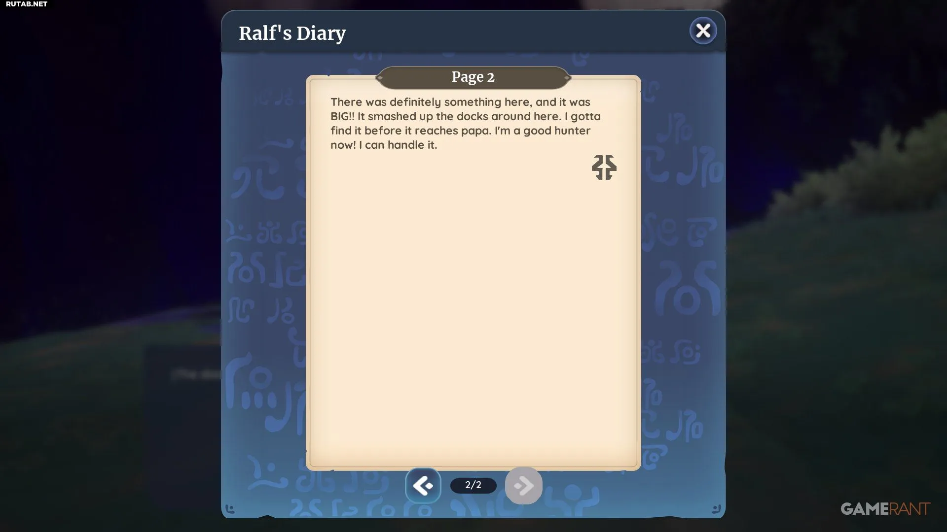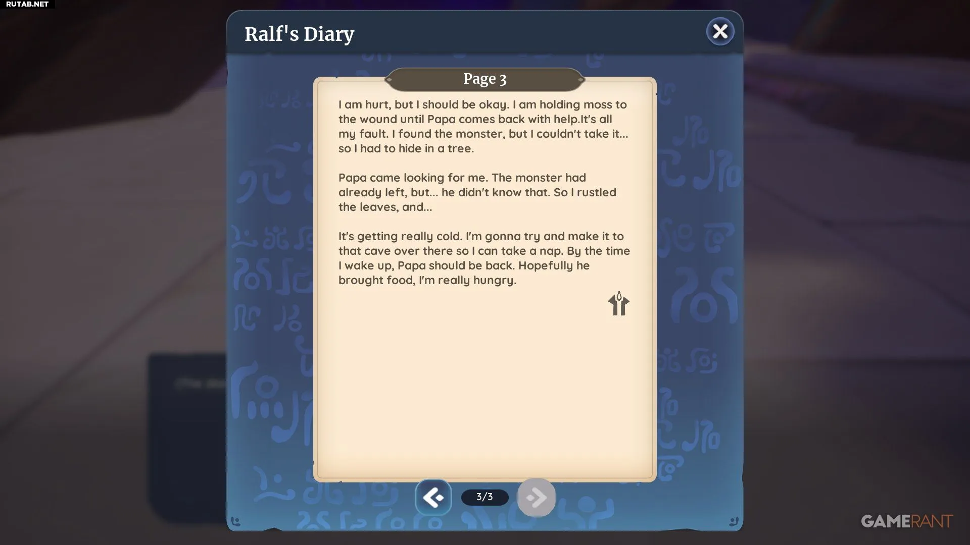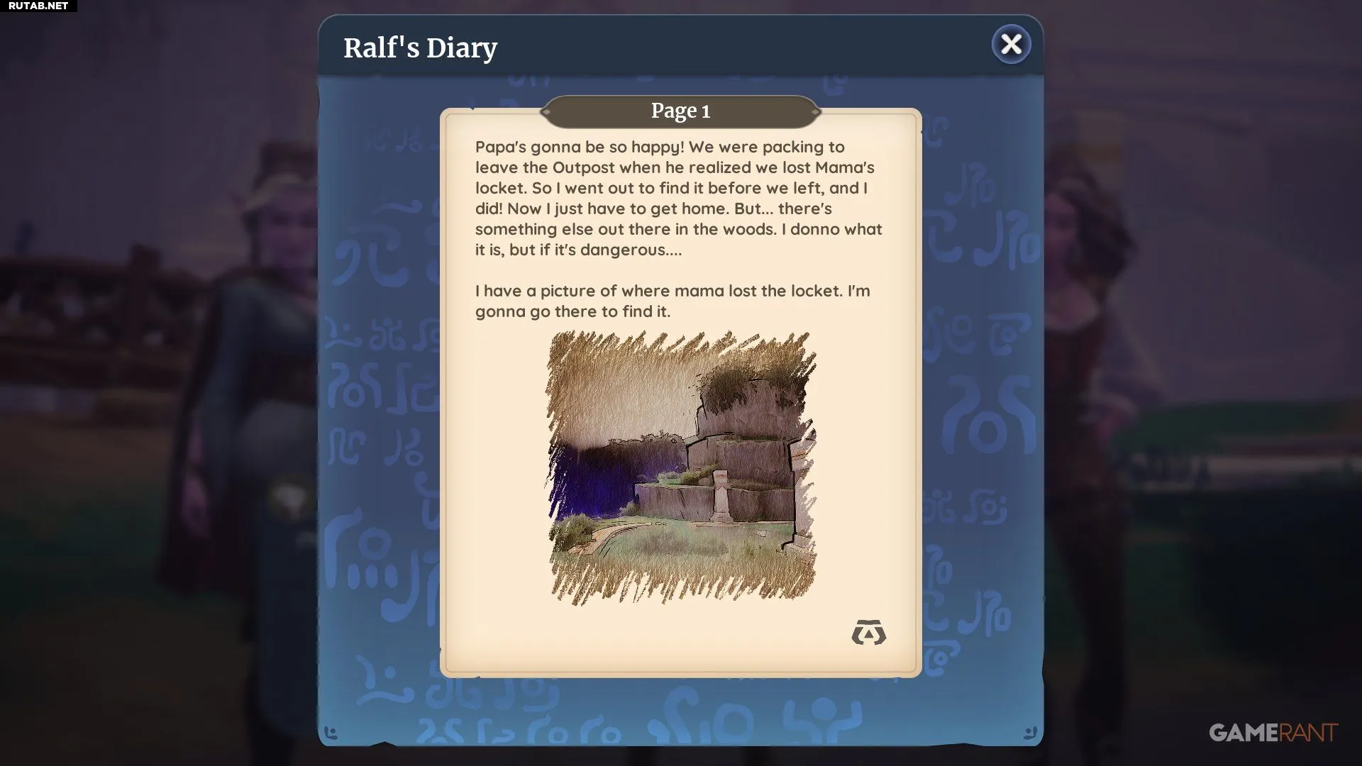 Двигайтесь на север от текущего места, чтобы найти утёс. Забравшись на него, вы приблизитесь к луже Эха на земле, где можно найти ещё одну запись из дневника. В ней говорится, что Ральф отправился искать медальон своей матери там, где она его потеряла, но нашёл нечто опасное: чудовищного зверя.