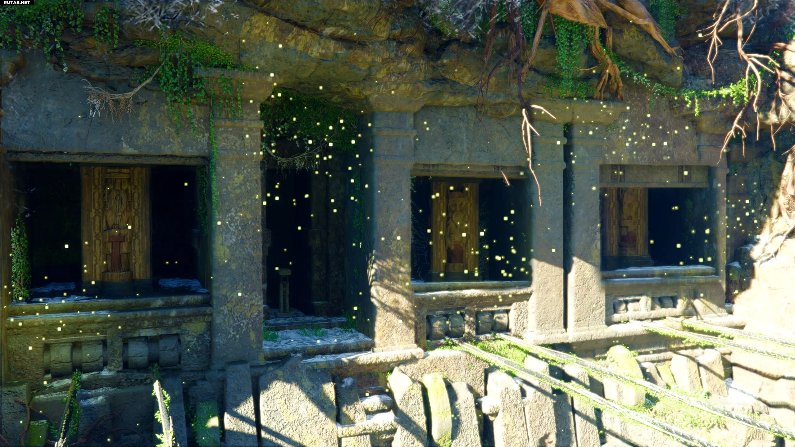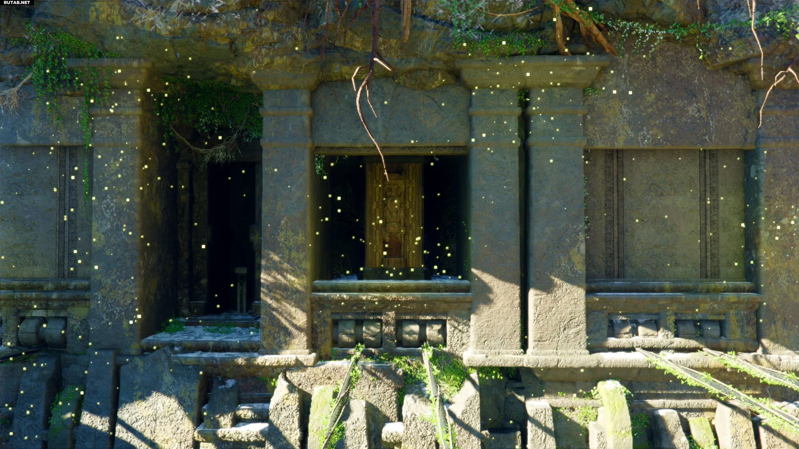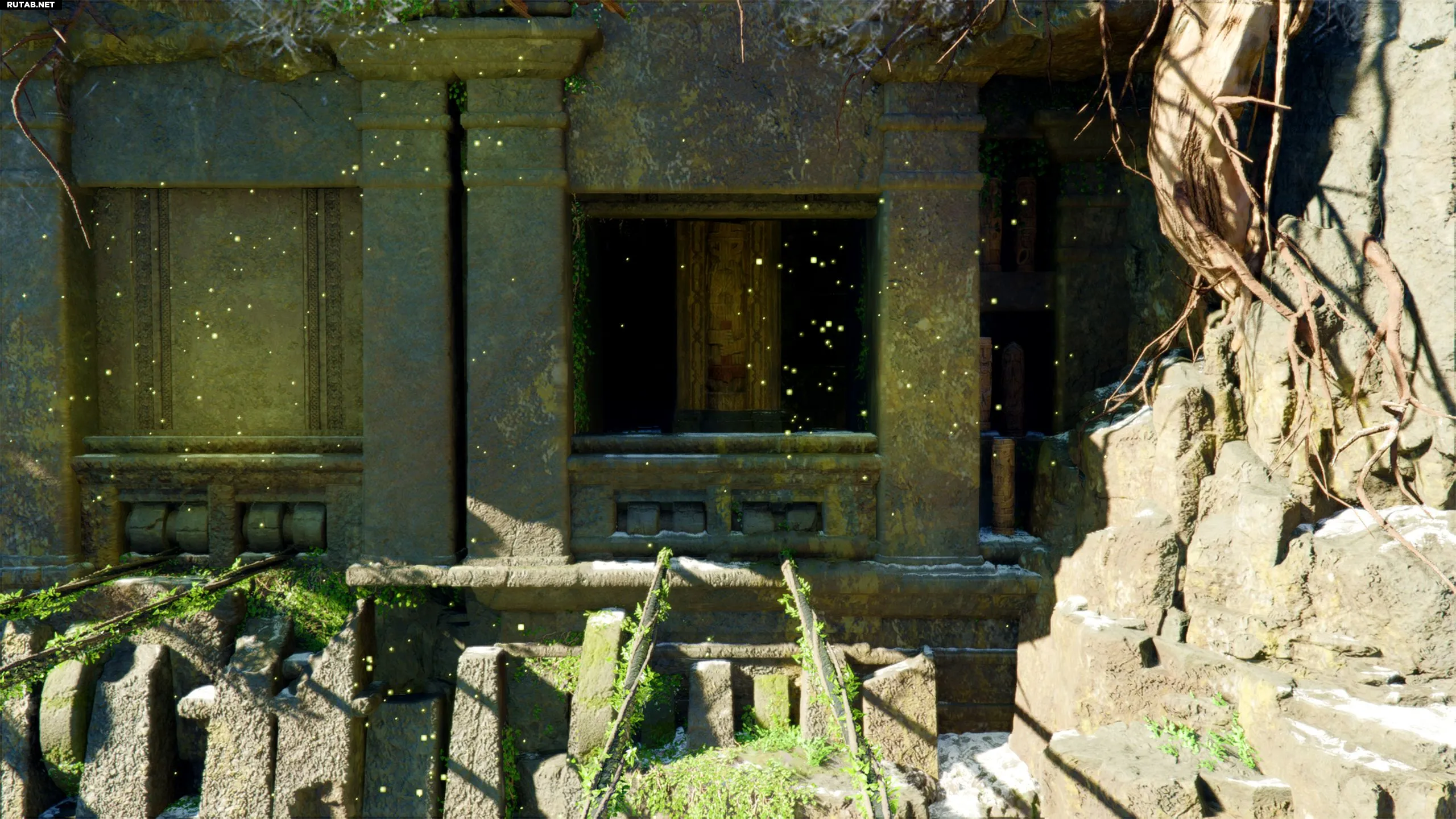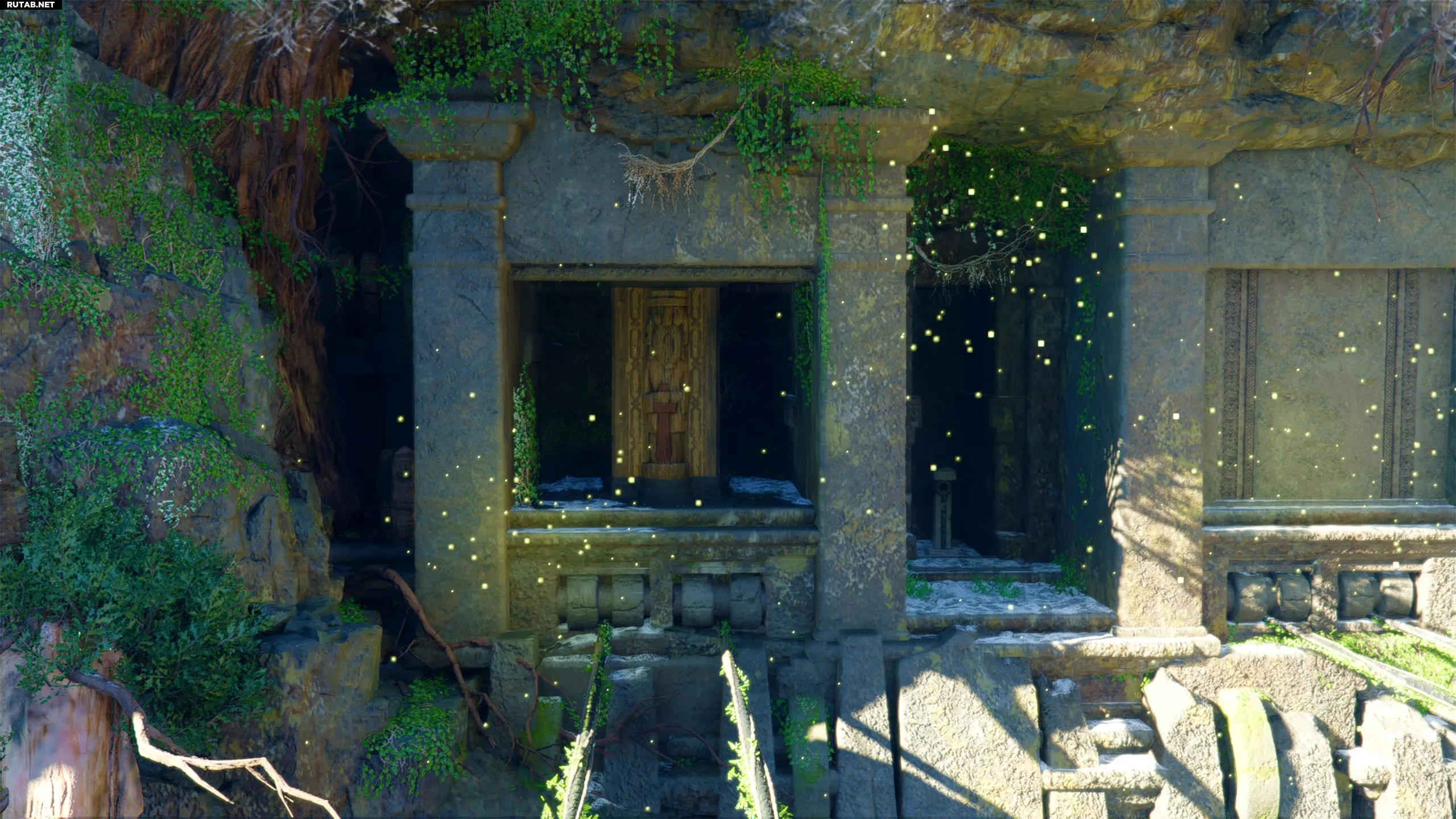 Три статуи заблокированы воротами, которые открываются с помощью тяжелого ящикообразного механизма. Нужно толкнуть его до упора, затем забраться на него и использовать лук, чтобы стрелять в статую и вращать ее.