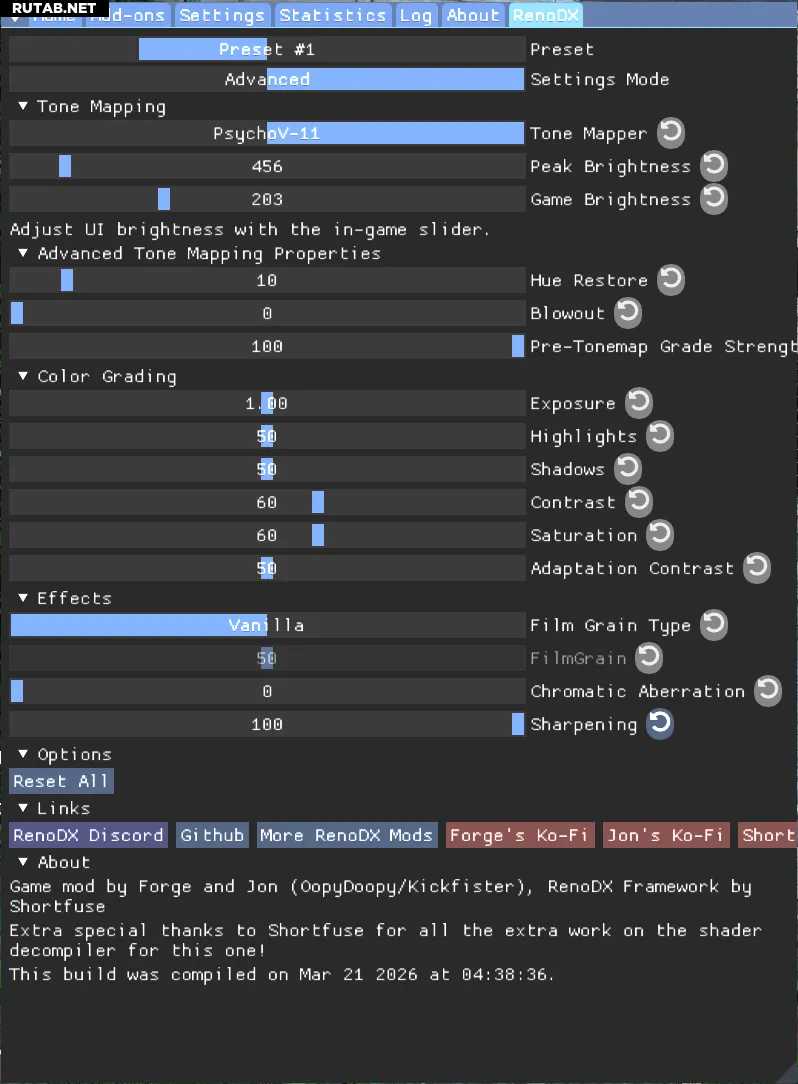 - Перейдите на вкладку RenoDX и выберите режим настроек Advanced.