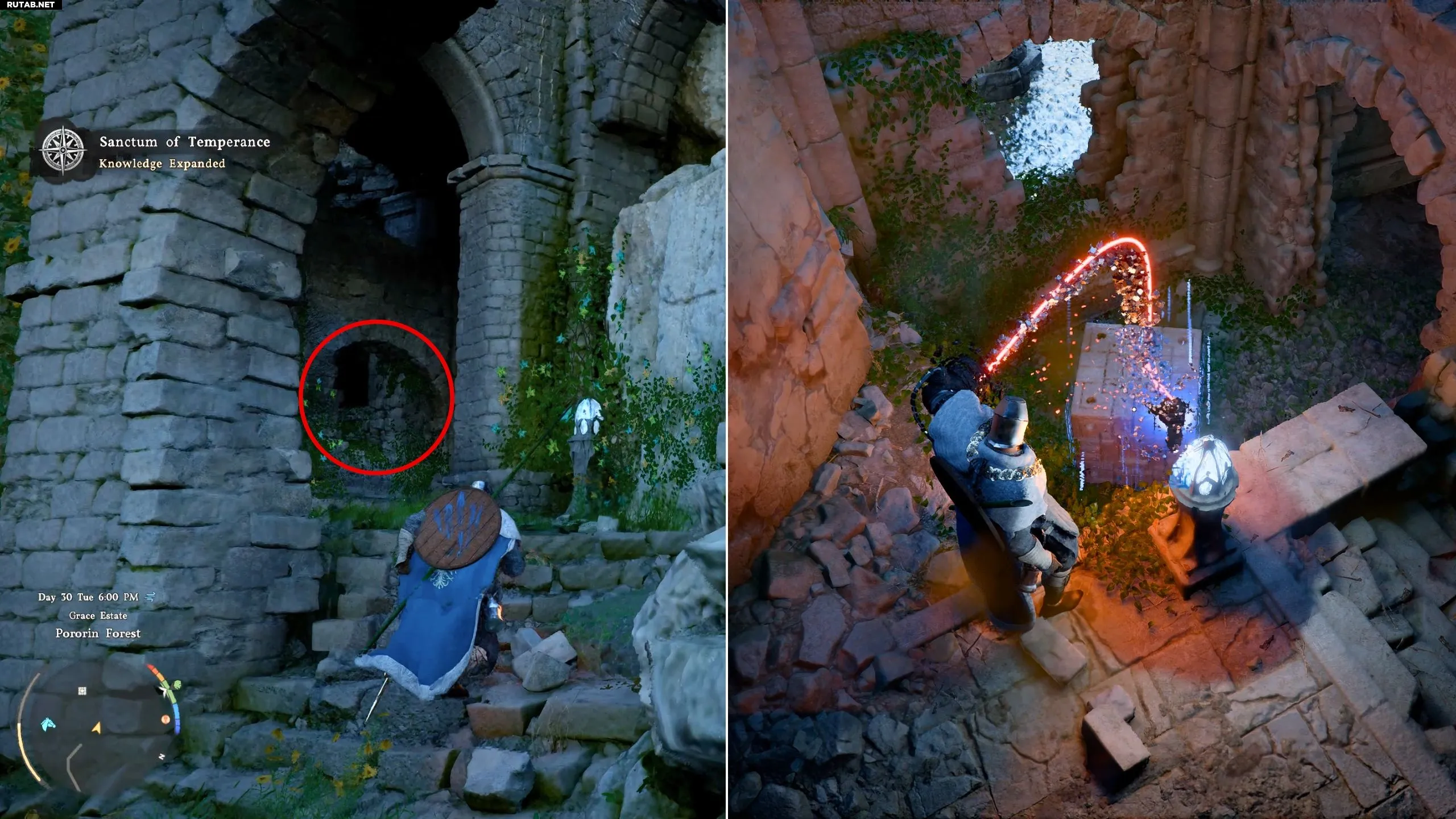 Заберите Ядро, и за ним откроется проход, заросший лозами. Сожгите их с помощью умения «Ослепляющая вспышка». В маленькой комнате внутри вы найдете сундук с сапогами «Защитная пластина Одека», которые обладают ядром регенерации здоровья.