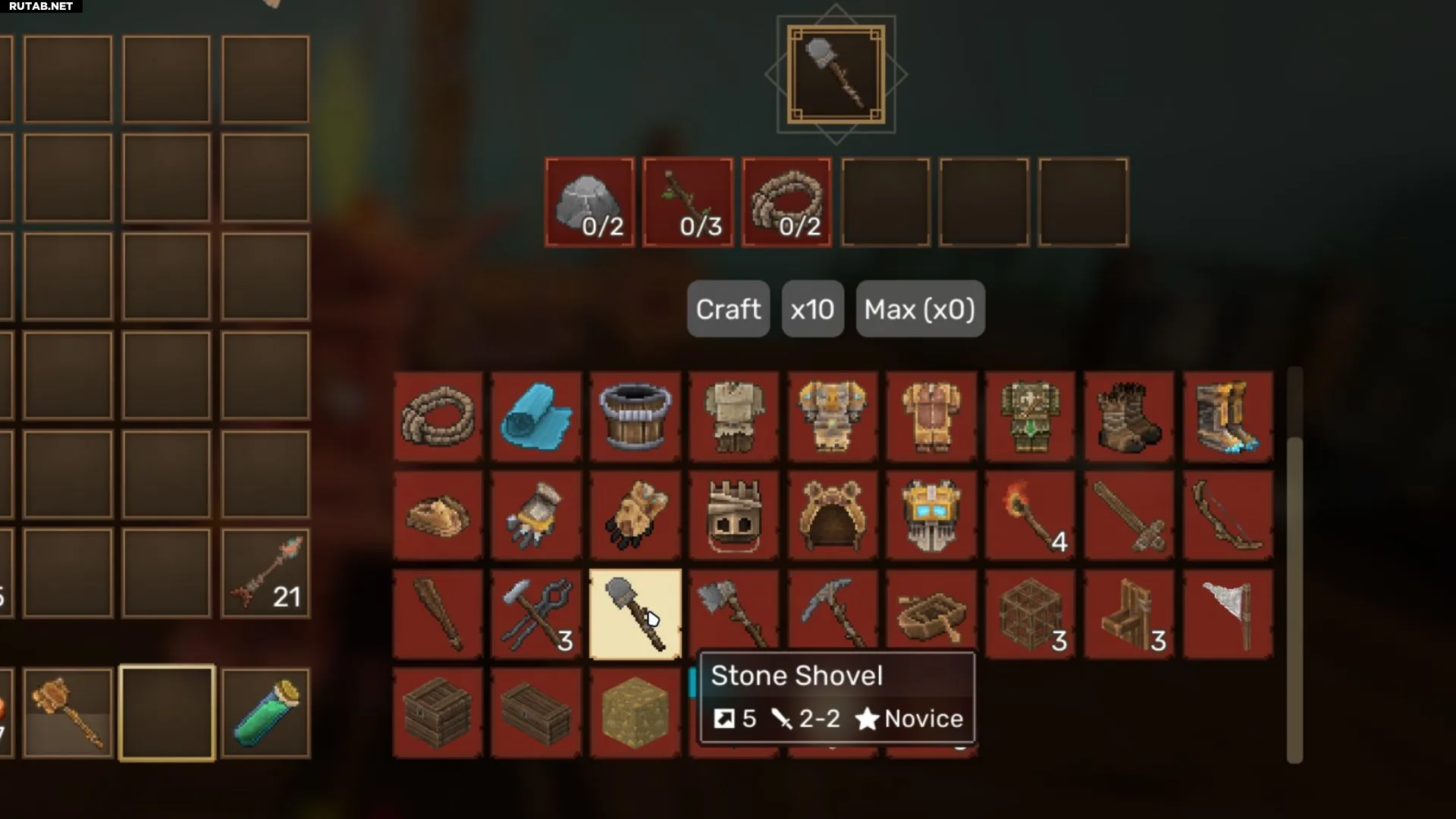 - Каменная лопата: создаётся в инвентаре или на Кузнечном столе. Требует: Камень (2), Палка (3), Верёвка (2).
