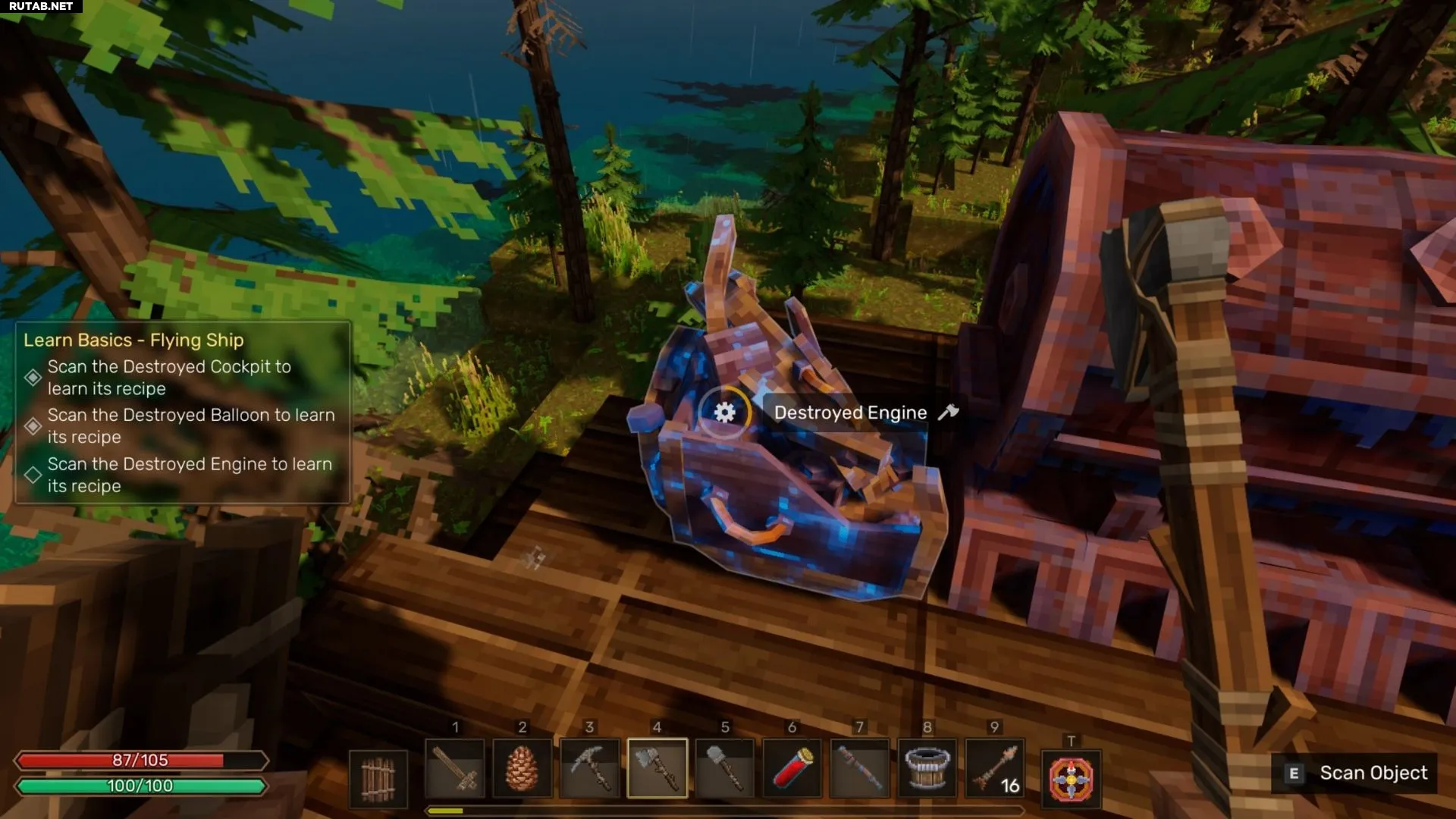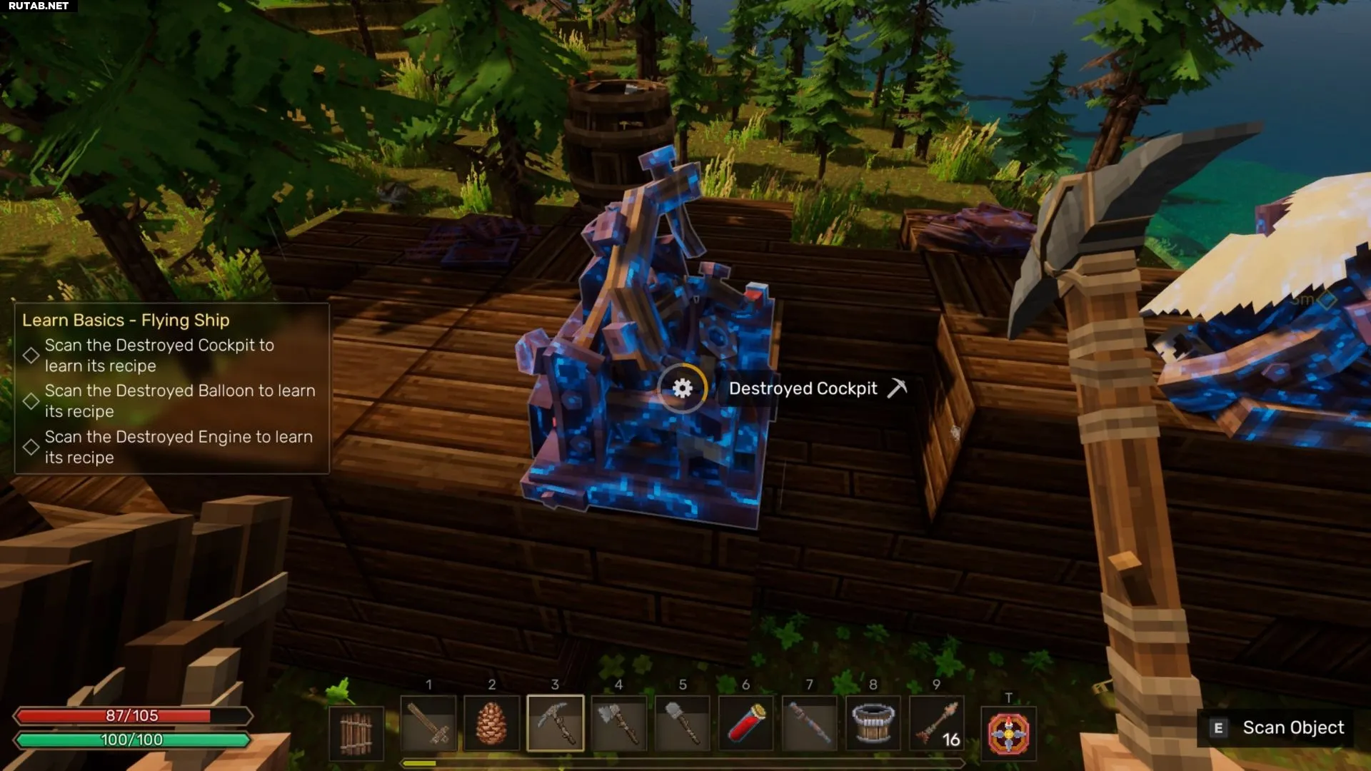 Исследуйте разбившийся корабль. Собирайте все найденные детали из парового металла и разбивайте киркой все светящиеся фиолетовые части корабля. Ваша цель — полностью разобрать судно на ценные ресурсы.