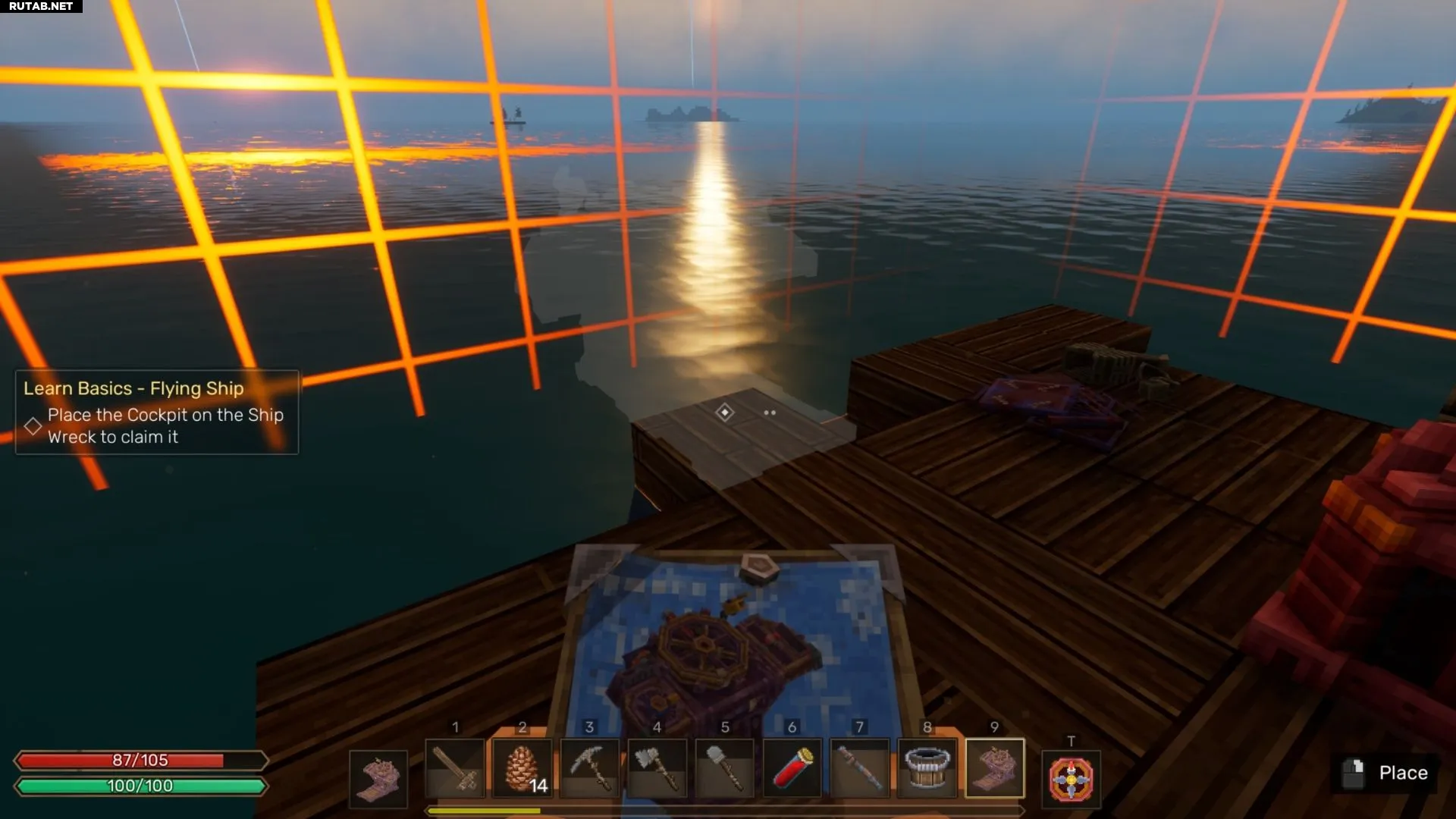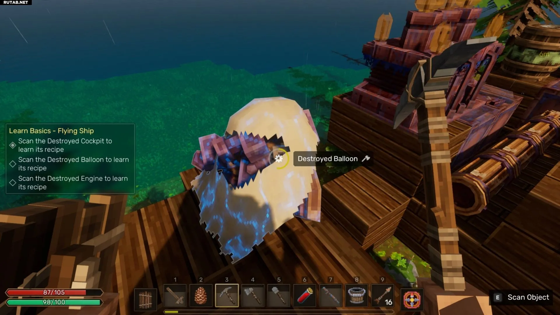 Найдите понравившийся брошенный корабль и установите Кабину пилота на место управления, чтобы заявить права на него. Затем разместите Энергогенератор, Деревянный двигатель и Деревянный аэростат рядом друг с другом, чтобы они соединились в единую конструкцию.