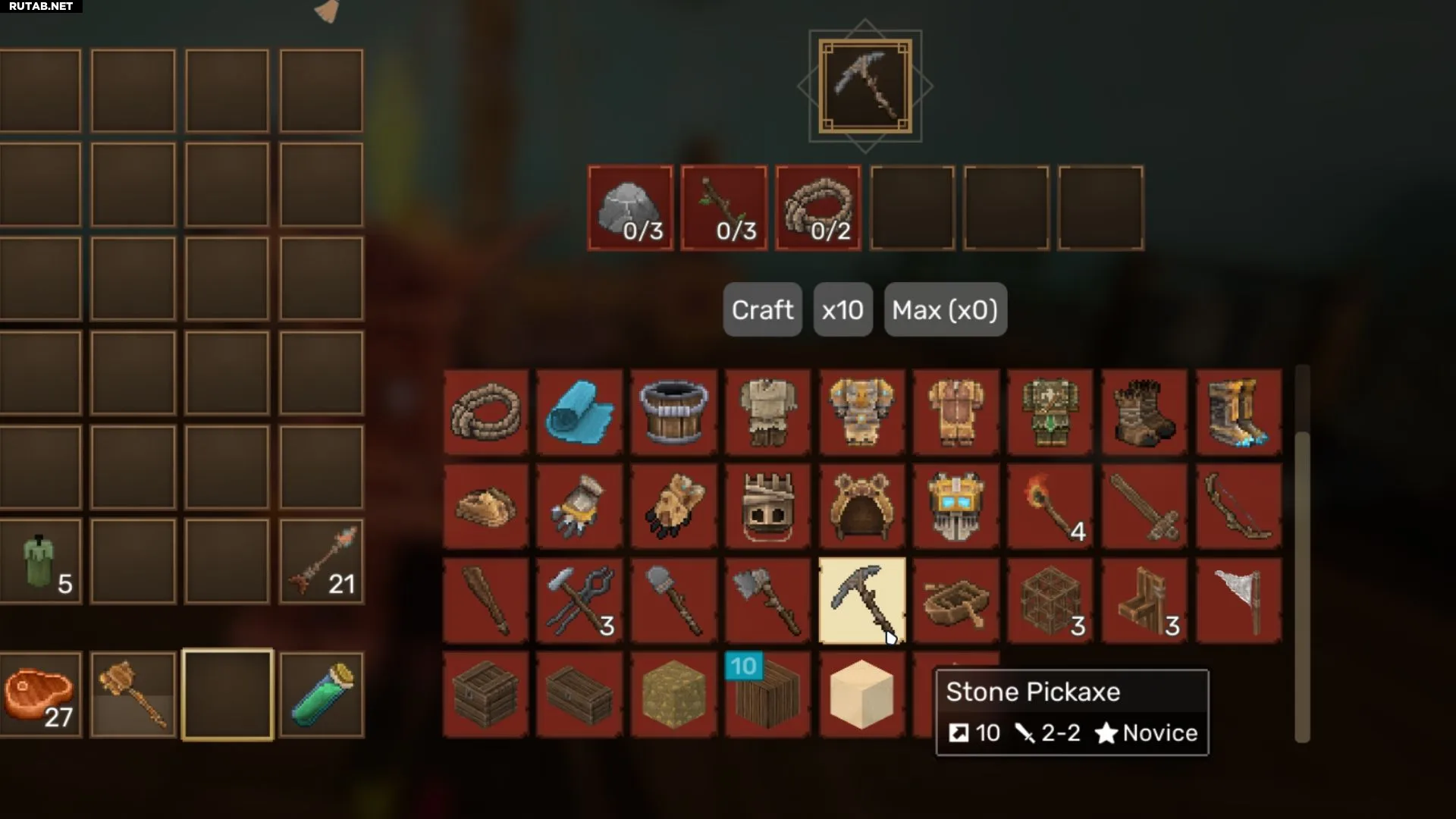 - Каменная кирка: создаётся в инвентаре или на Кузнечном столе. Требует: Камень (3), Палка (3), Верёвка (2).