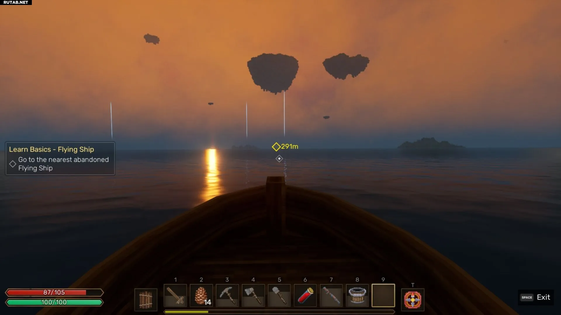 Доберитесь до края острова, спустите лодку на воду. Возьмите управление и проплывите вокруг острова, пока не наткнётесь на обломки корабля. Это активирует первую основную миссию игры: постройку Летающего Корабля.