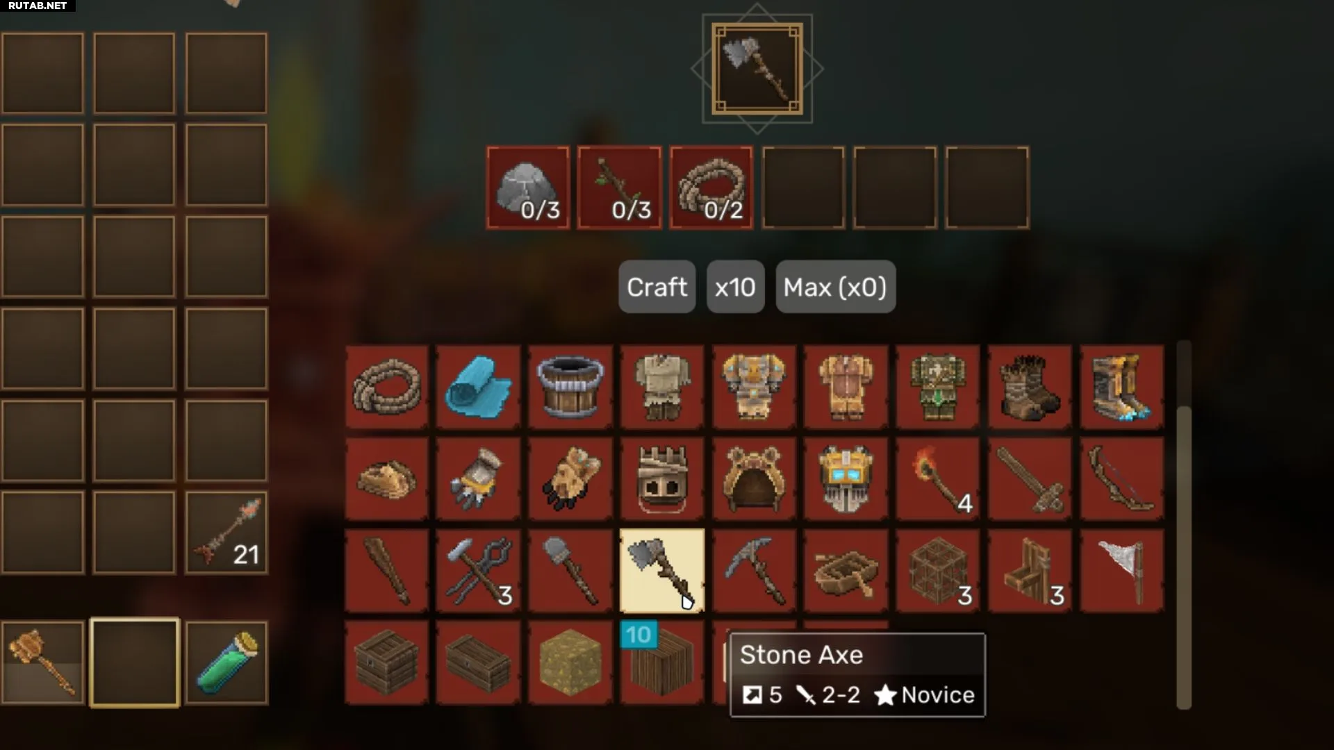 - Каменный топор: создаётся в инвентаре или на Кузнечном столе. Требует: Камень (3), Палка (3), Верёвка (2).