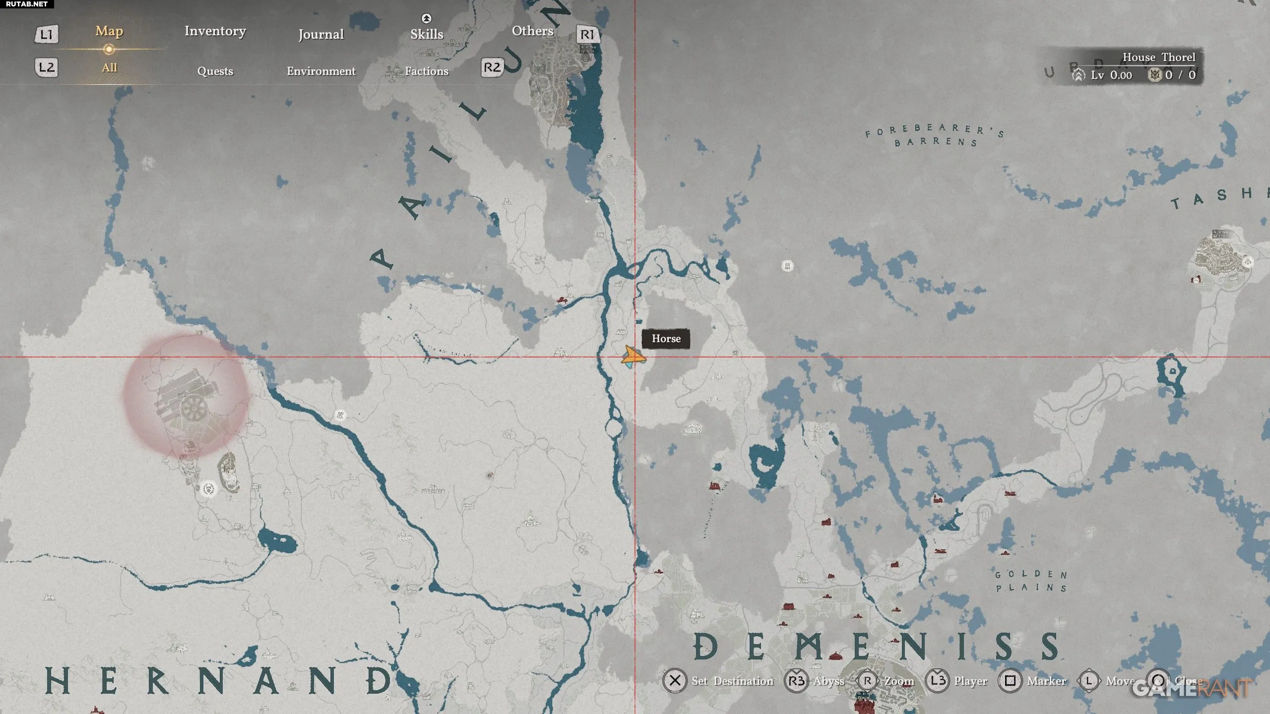- След приведёт вас к пещере, которая выходит на небольшое кладбище в Горах Королевского Щита (Деменисс). Мы отметили это место на картинке выше, чтобы вы могли направиться прямо туда.