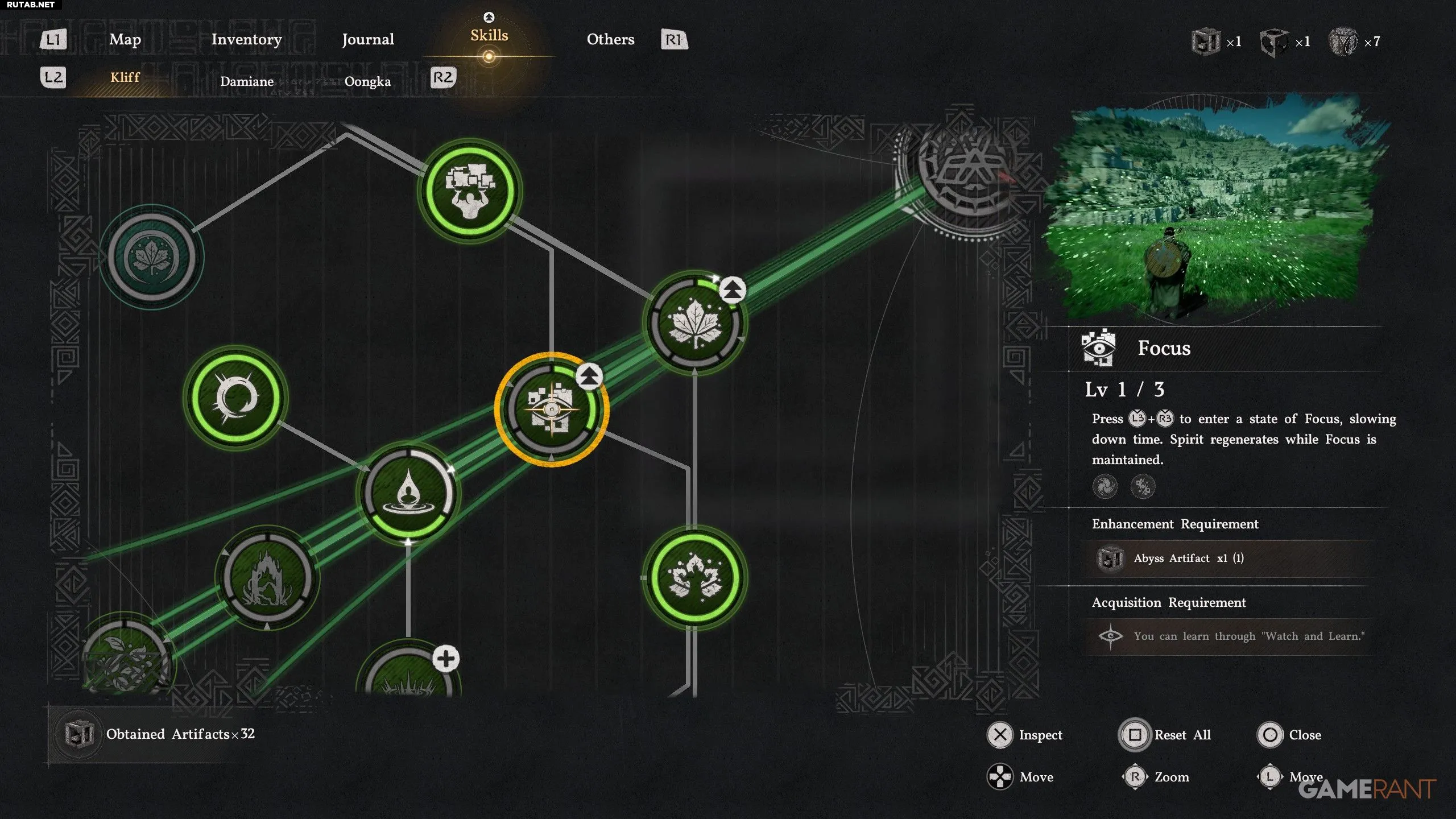 - Фокус — зелёное древо навыков, получается автоматически. Позволяет нажать L3+R3, чтобы замедлить время и восполнить дух.