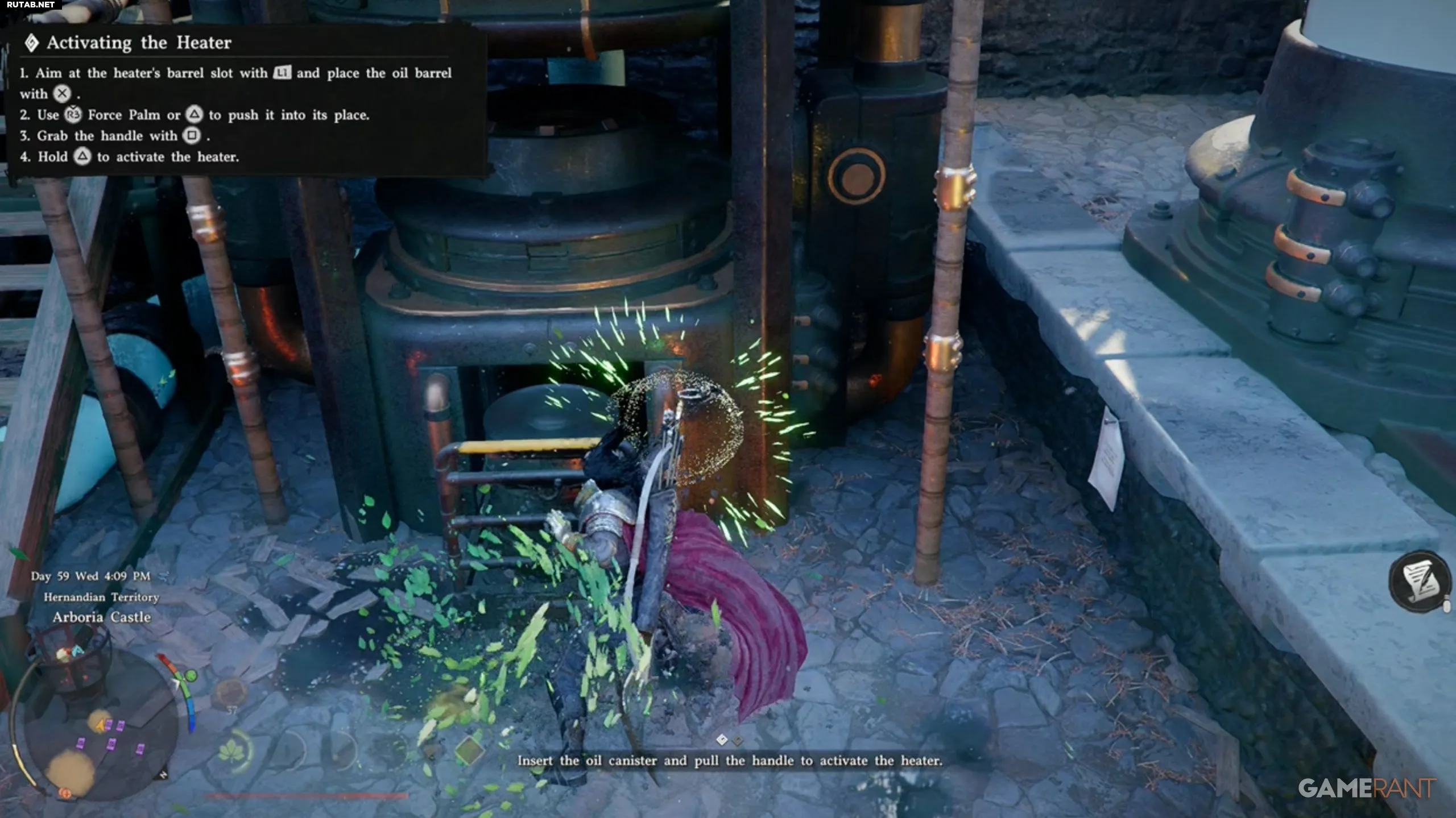 - Отнесите бочку к нагревателю, зажмите L1, а затем нажмите X, чтобы поместить её внутрь.