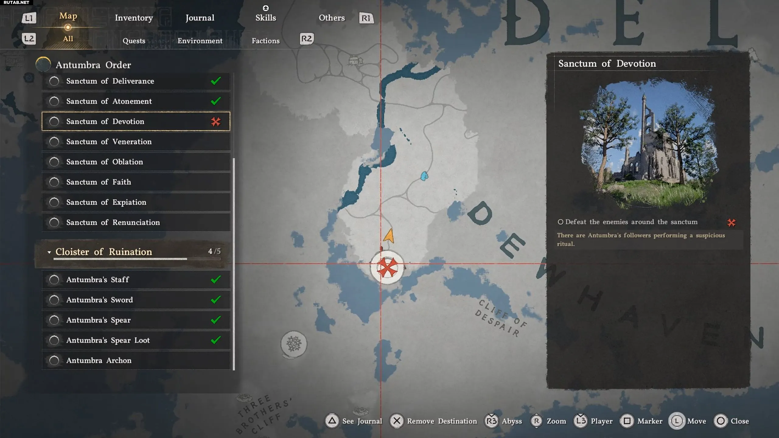 Направляйтесь к северо-востоку от Змеиного Болота и войдите в Святилище Откровения, чтобы победить культистов, а также Копьё Антумбры. После освобождения святилища очистите его.