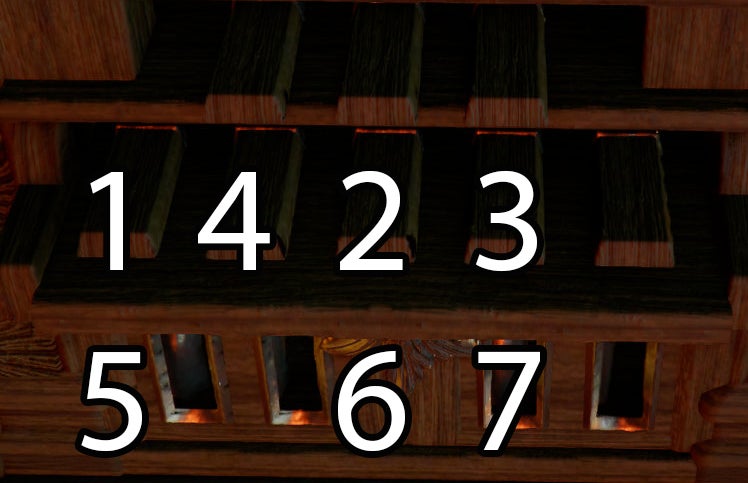 Если загадка не решается, возможно, нужно отрегулировать положение одного из цилиндров. Сначала используйте правую кнопку, чтобы проверить их позицию. Серебряные крышки должны быть на уровне рисунка, черная линия — на уровне верхнего края деревянной части, а золотые основания должны оставаться внутри деревянного сектора.